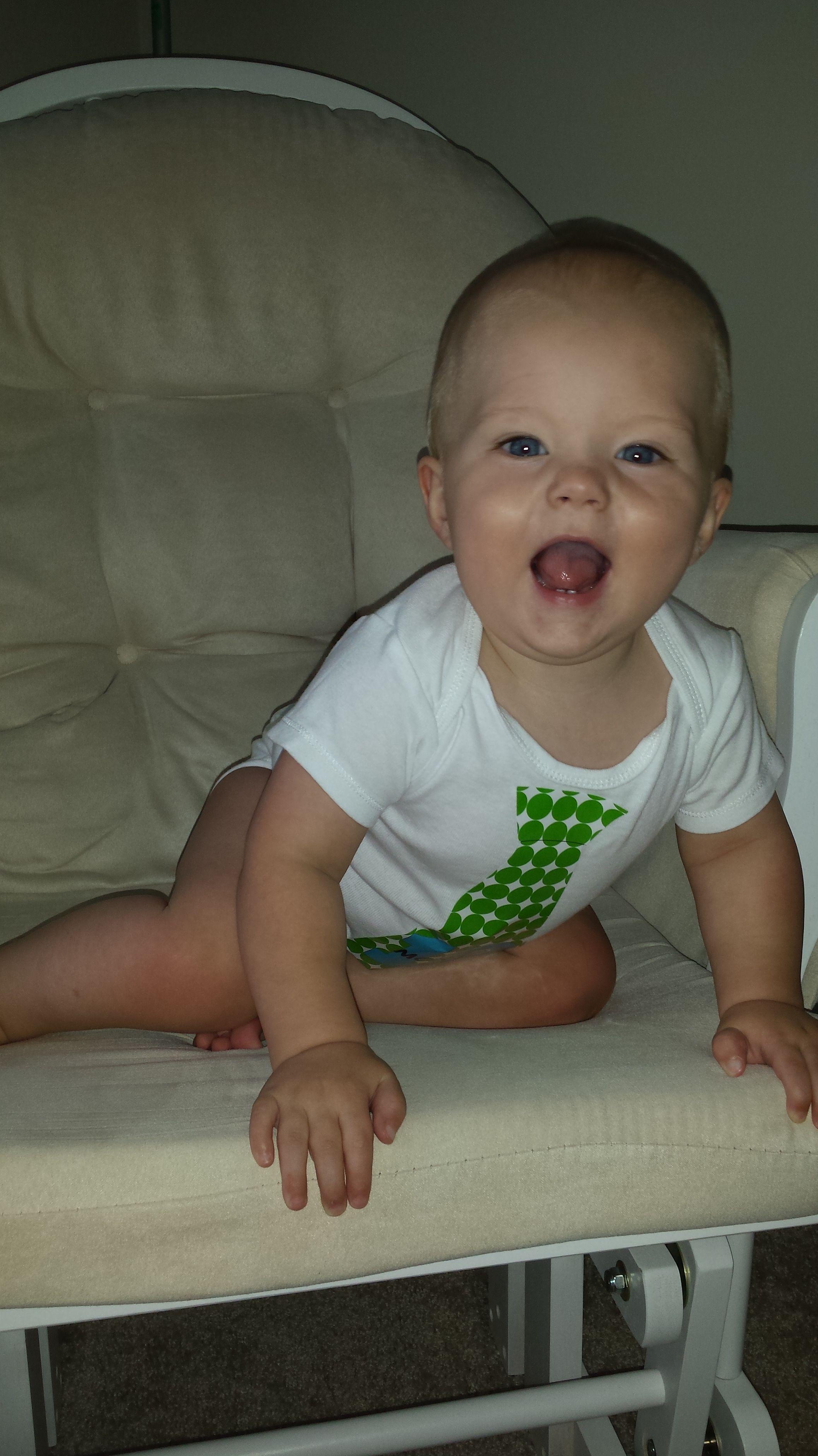 Likes & Dislikes: Gerrit still enjoys being on the move! He crawls all over the place now, although he still does the army crawl when he’s frustrated or tired. He still likes us to walk him around, but he’s pulling up on furniture now (and me when I’m standing in the kitchen!) and walking along. He is still not sure about turning around corners though!
