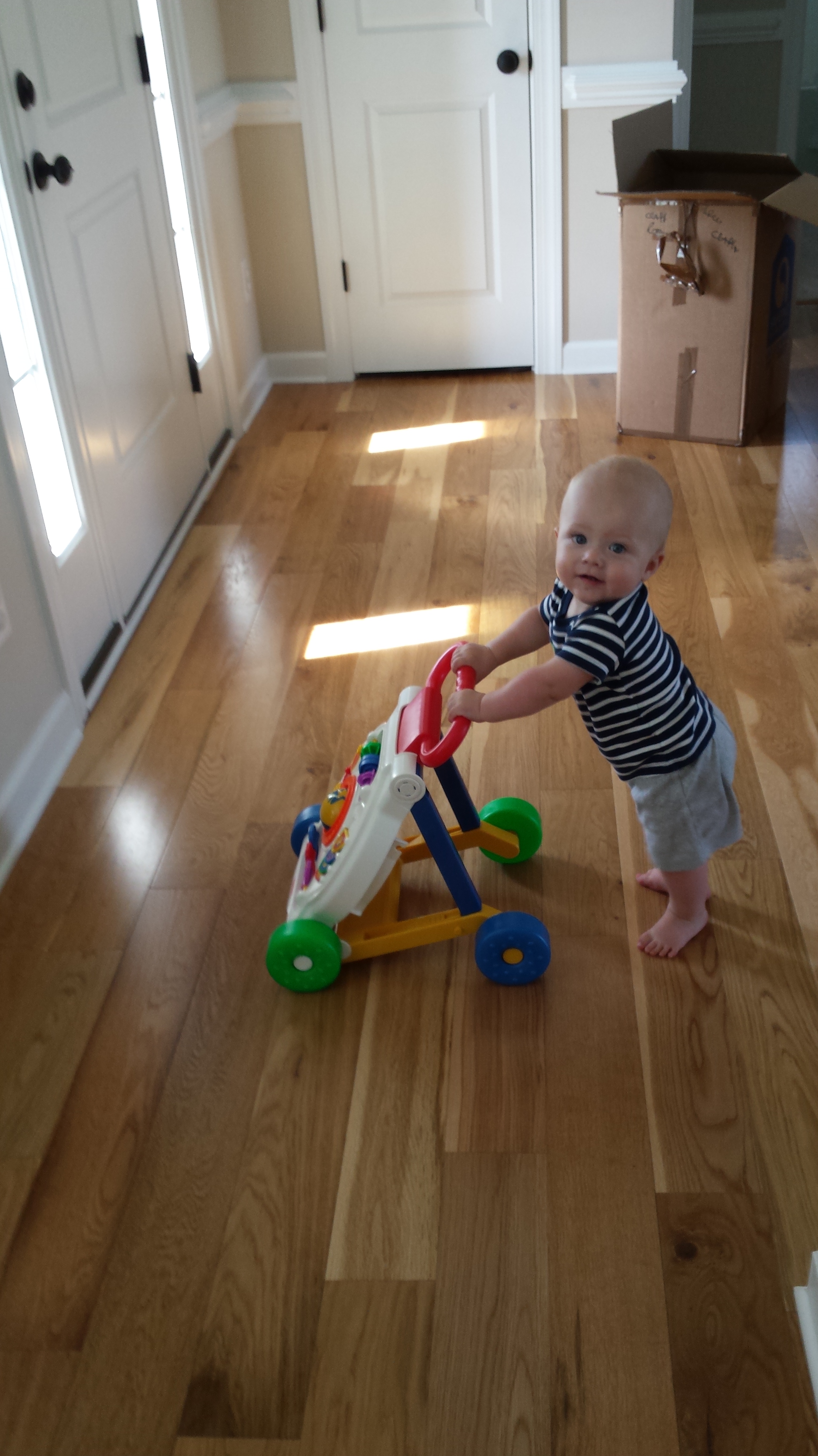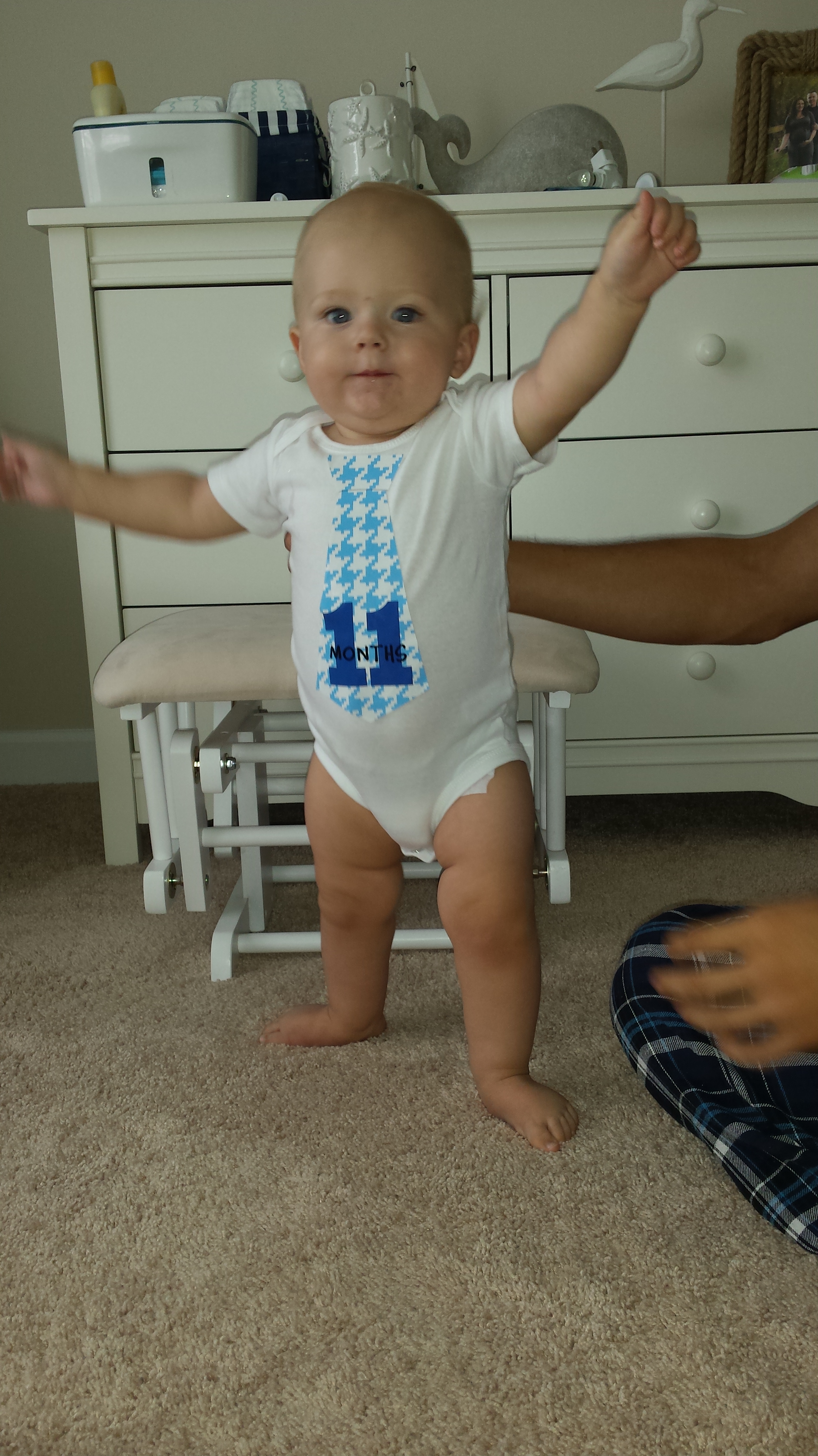 Milestones: cruising, climbing stairs, taking steps, waving, pointing, handing us items, shaking his head “no,” a lot more babbling, saying “Dada” and “dat” (that), vocal volume (whispering and yelling)