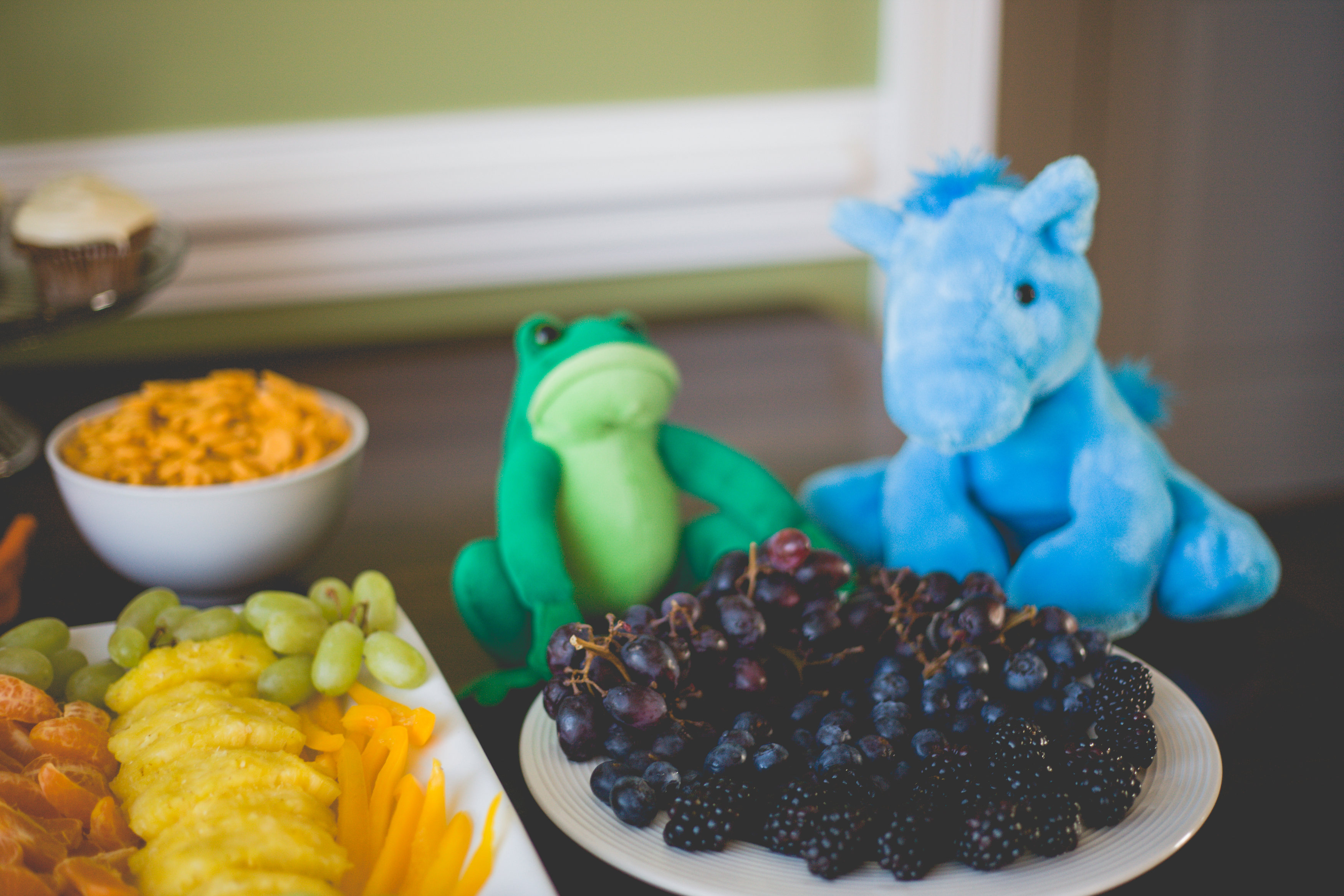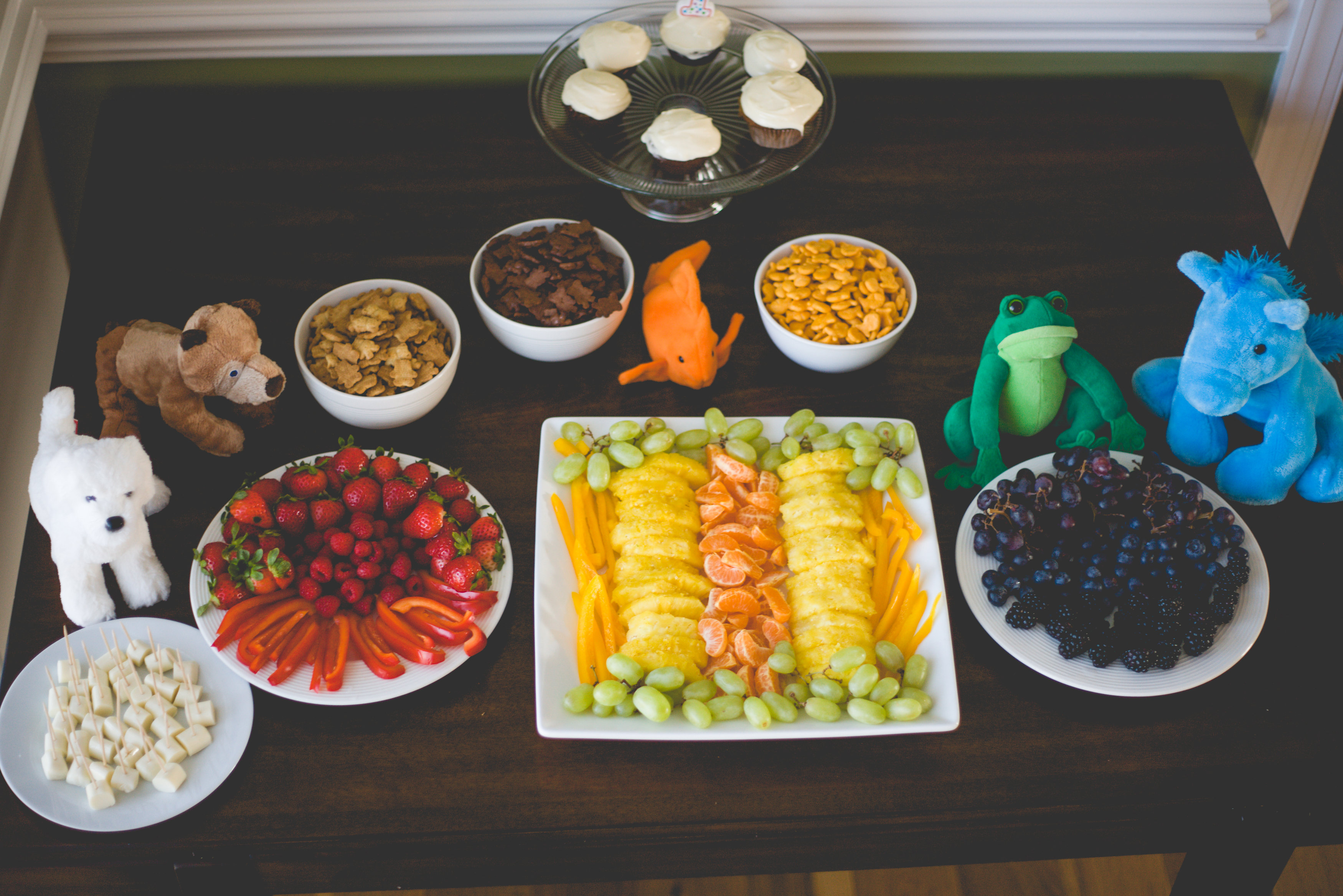 My mother-in-law did such a nice job arranging all the fruits and veggies in a rainbow for the snack table! There were strawberries, raspberries, and red pepper strips (red bird), mandarin oranges (gold fish), pineapple slices and yellow pepper strips (yellow duck), green grapes (green frog), blueberries (blue horse), purple grapes (purple cat), and blackberries (black sheep). We also had mozzarella cheese (for white dog), Teddy Grahams (for brown bear, of course), and Goldfish crackers (for gold fish). All kid-friendly foods that I hoped would be just as yummy for the adults.