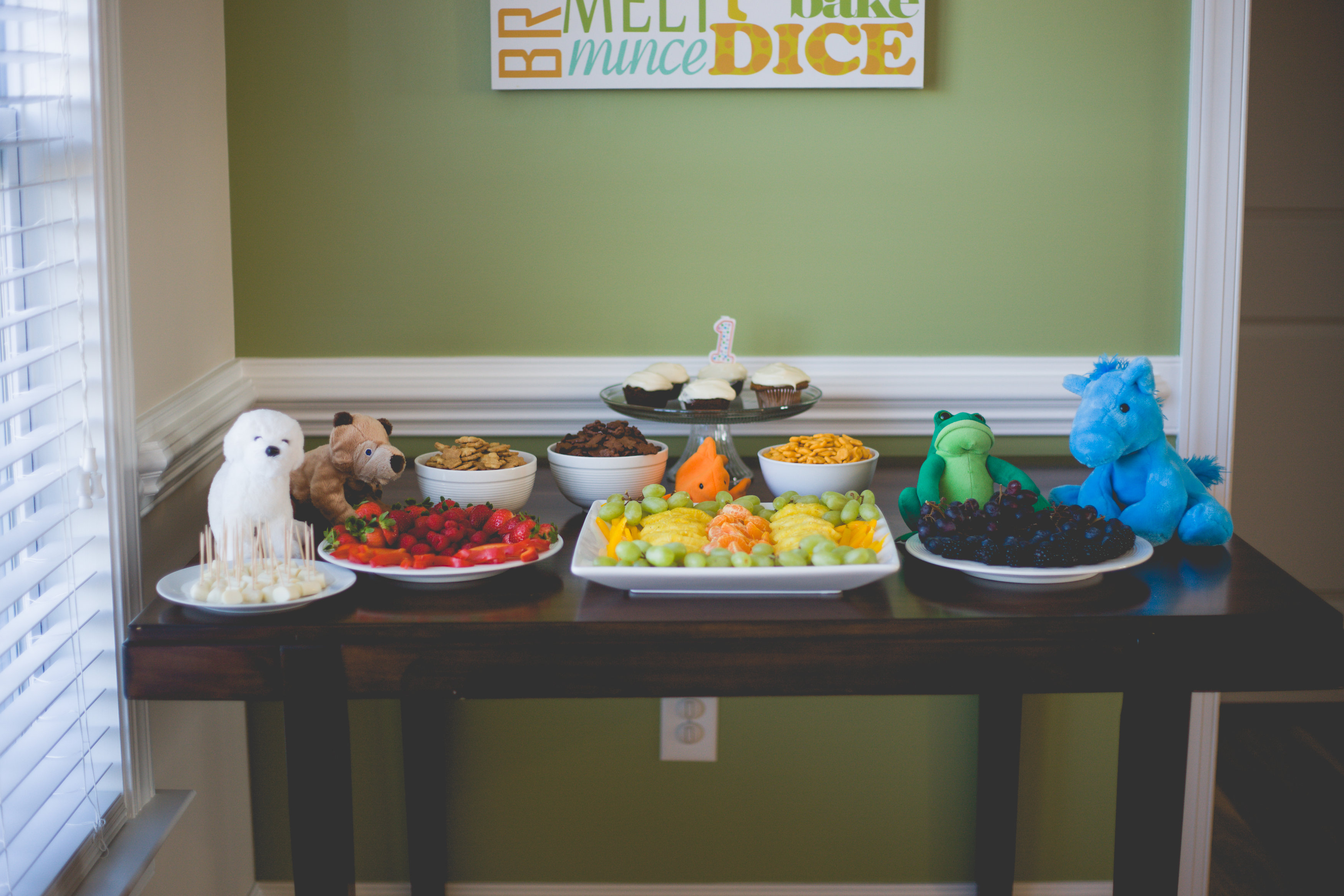 The “My First Year” mantel was one of my favorite decorations for the party. I collected various 5×7 photo frames, painted them to go with the colors in the book, and got prints of Gerrit’s monthly photos. I also scoured Amazon for animals in the appropriate colors (blue horse was a tough one…). My sister found a few other animals that she sent to me so I had extras to add to the snack table:
