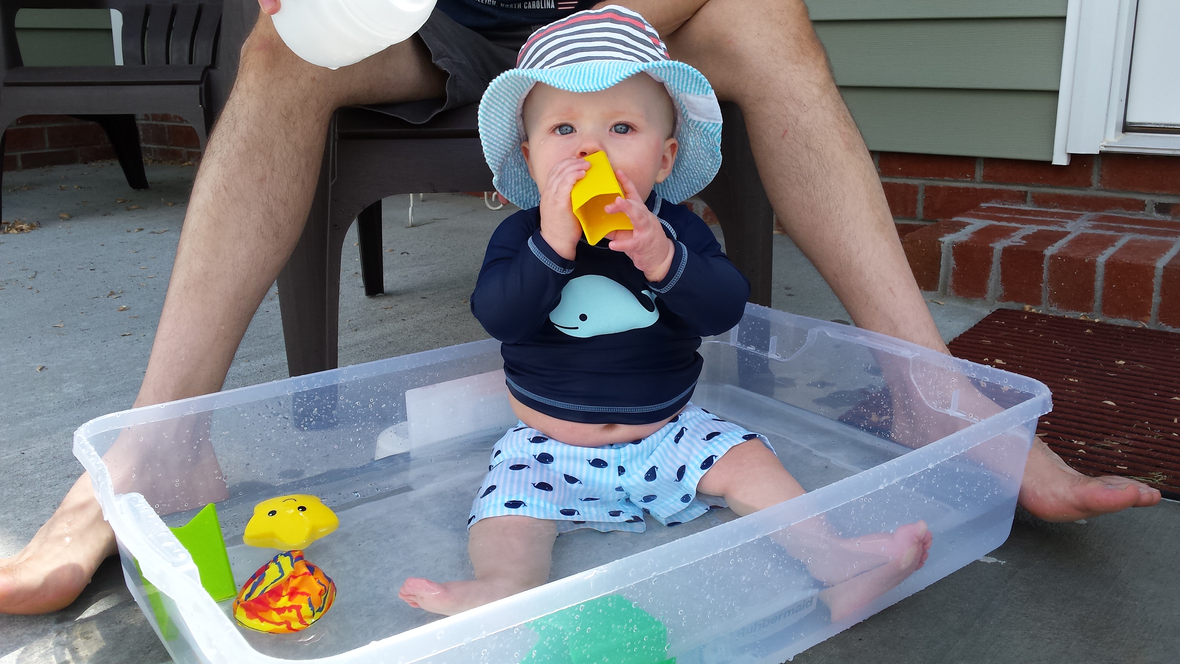 Once he was sitting on his own, I would put water in a bowl with toys or put him in an under-the-bed storage box filled with water as a tiny pool for him to splash and play in.