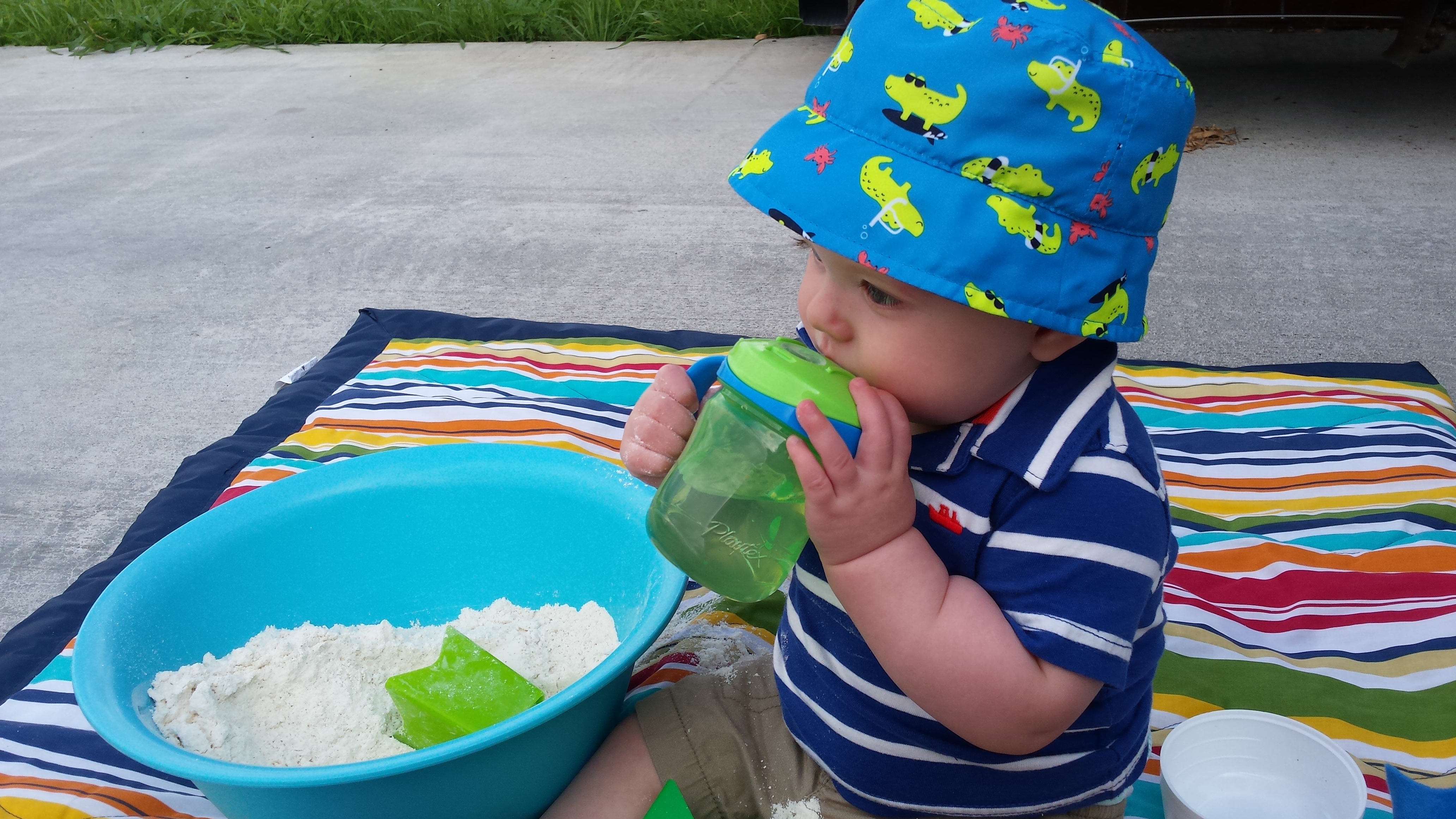 When Gerrit was a baby, I did not want him playing with sand, only because I knew he would try to put handfuls of it in his mouth. An alternative? White corn flour. It’s very fine, so be careful about your baby’s eyes, but it’s a fun alternative to sand play.