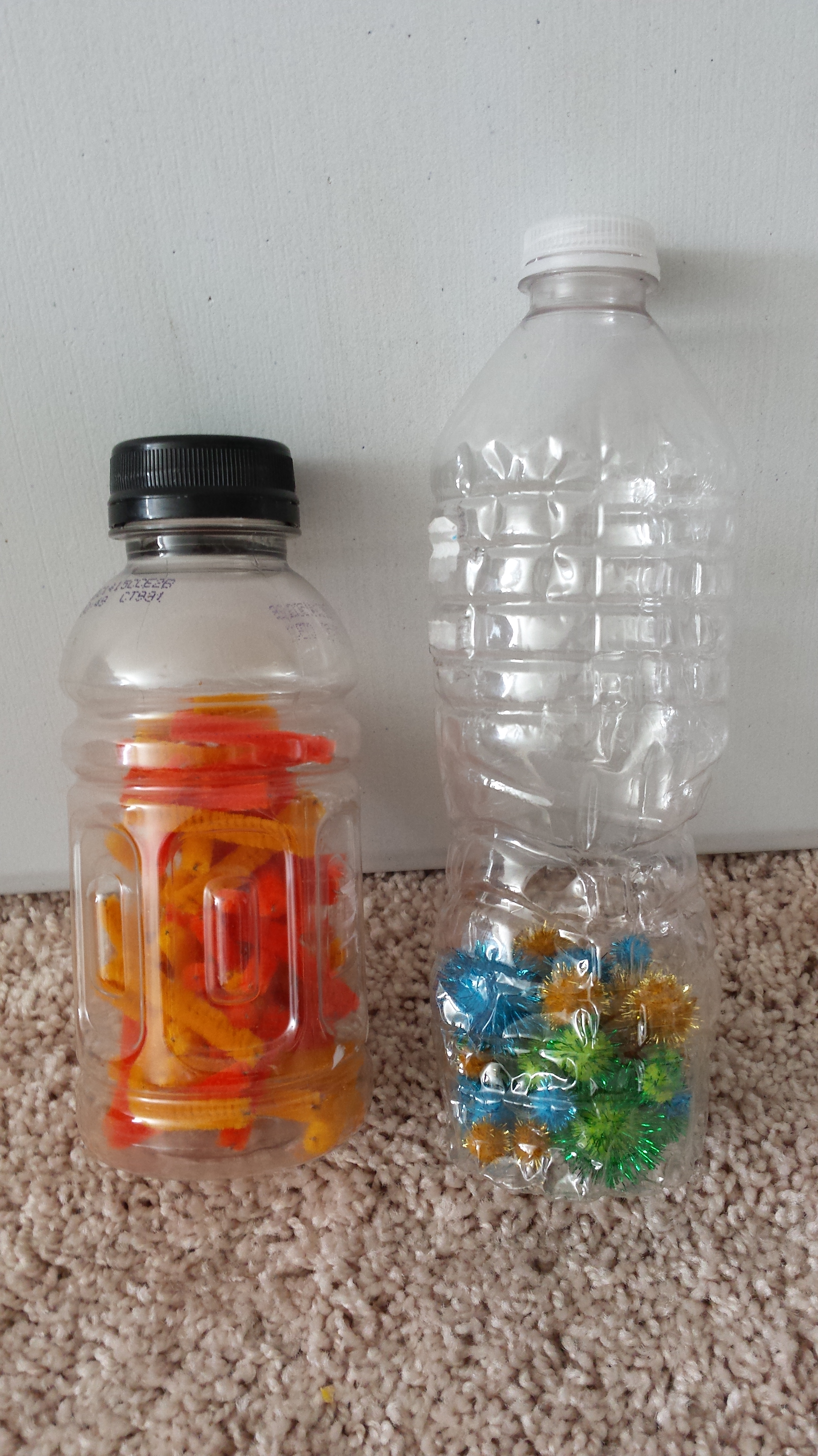 Since Gerrit enjoyed that green sensory bottle so much, I started thinking of new items to put in bottles for him. We took a trip to Michael’s for some craft items, and I got to work during nap time.