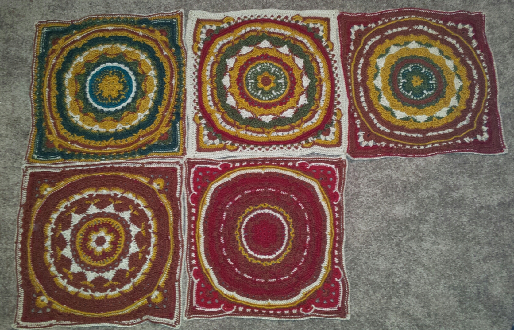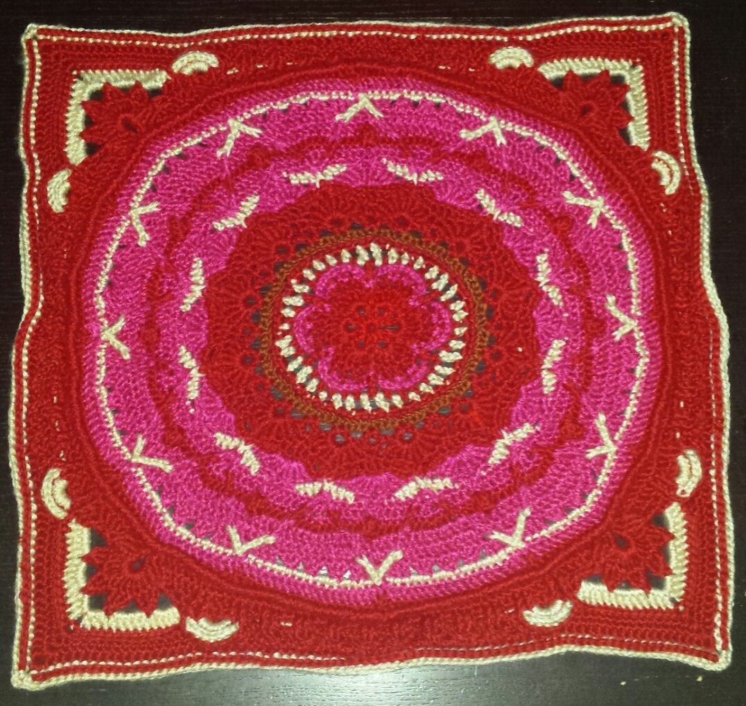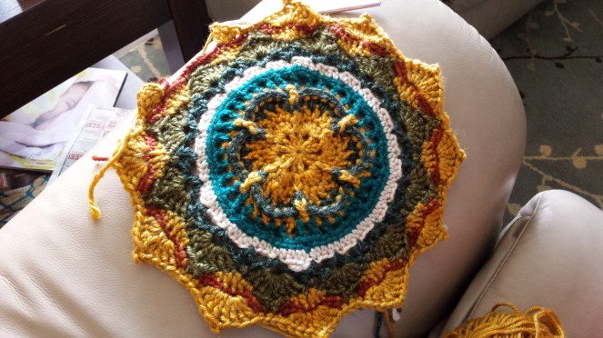 This led me to Sophie’s Garden, which you can see in process above. It is a mandala pattern, done in rounds, with frequent color changes. I fell in love with the pattern! The textures are just beautiful, and it’s both relaxing and challenging to work on. My biggest issue with crochet projects is getting bored, losing interest, and setting a project aside to start something new. So many times, those neglected projects stay neglected and never get finished. But there are so many different stitches and color changes in Sophie, that I have not gotten bored at all!