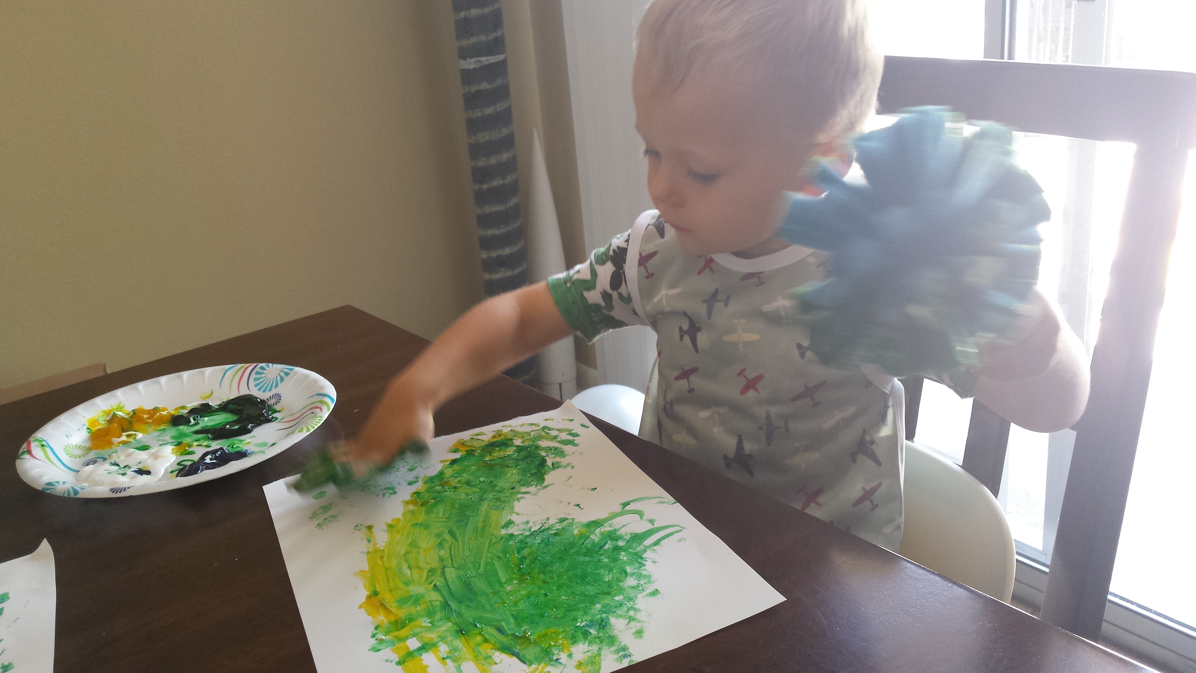 Gerrit really enjoys playing with Play Doh & painting. We basically had Play Doh out almost every day. It was fun watching him learn to use the different tools to manipulate the dough over the year. He started out always wanting me to roll the dough or cut the dough, but he slowly started getting the hang of doing those things himself. Gerrit loves finger painting. I tried watercolors once or twice, but he really prefers getting in there with his hands and using different textures to mix colors. We always had plenty of artwork up on the wall to look at!