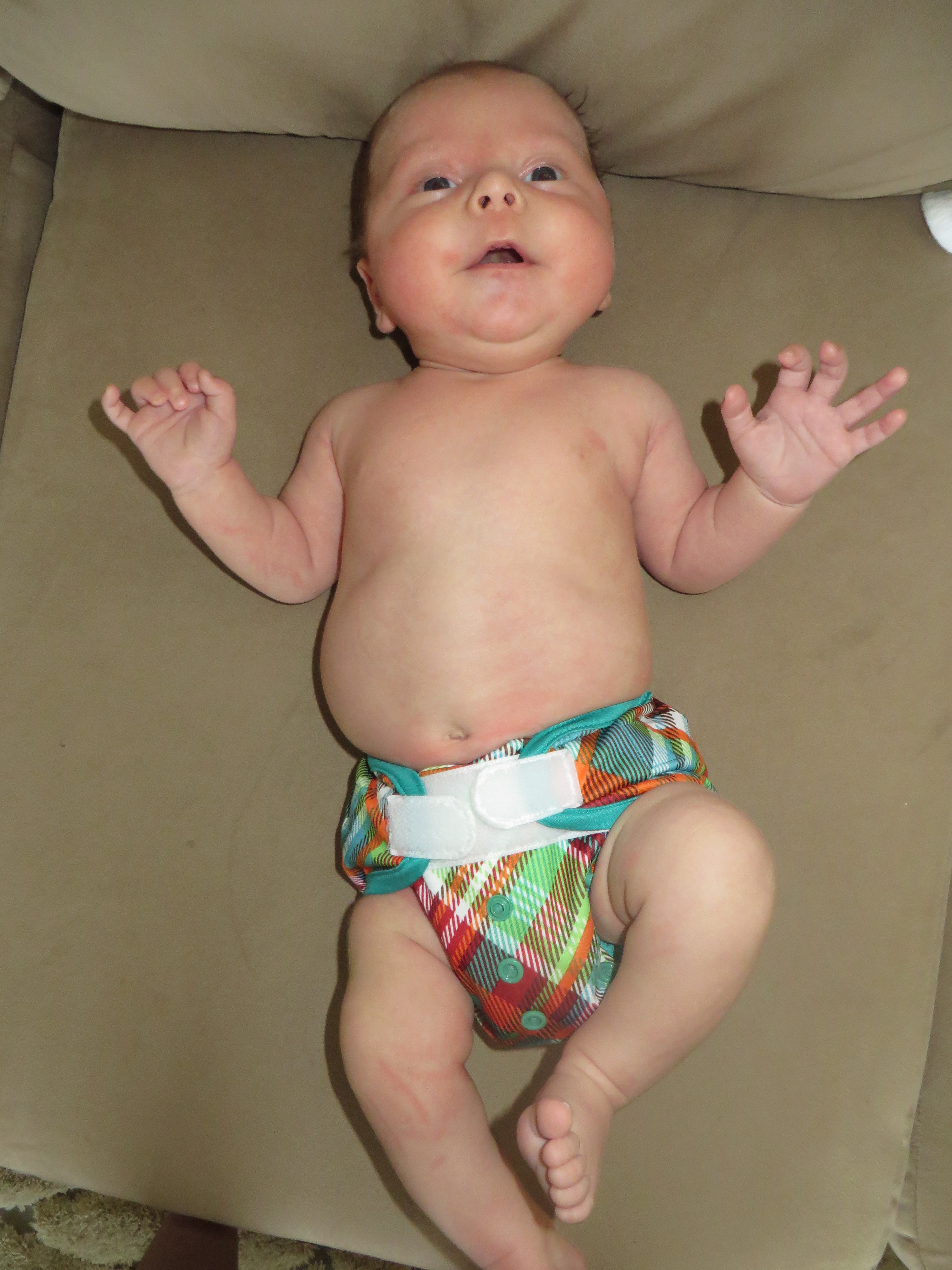 A couple of weeks later, when I was starting to feel better, I decided to give the cloth diapers another try. By then Berend was about a month old and had filled out quite a bit! I think the combination of him being bigger and me having had practice already from when he was smaller made me feel more confident in getting a good fit on him. From then we pretty much exclusively used cloth diapers on him during the daytime hours. The only reason I chose to keep using disposables at night is because of the lack of light (I try to keep the room as dark as possible when Berend wakes at night) and my sheer exhaustion: I wasn’t sure I’d be awake enough to get a cloth diaper on very well!