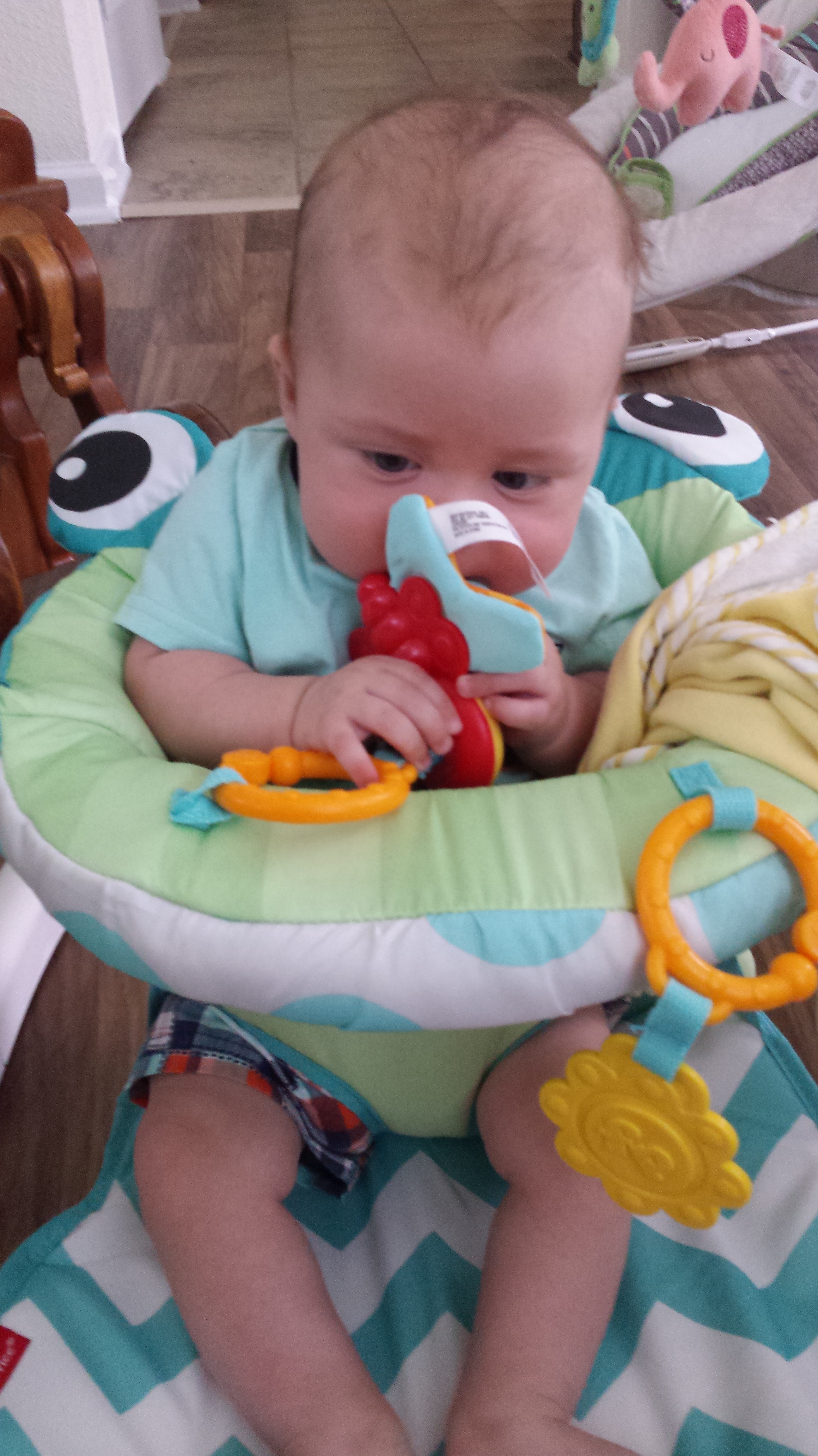 Dislikes: Being tired, being hungry, being held laying back, diaper changes at night, when toys don’t do what he wants, his play mat, seeing Mama walk away, the car seat (in the car & in the stroller)