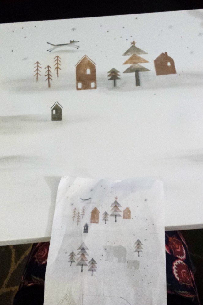 This is actually not a painting; it’s a napkin! I found it on Pinterest while searching for inspiration, and I loved this. It has the simple Scandinavian look I wanted, and it didn’t look too challenging. To make things easier on myself, I made stencils for the houses and the triangle trees. Everything else was me doing my best with some wine for confidence haha.
