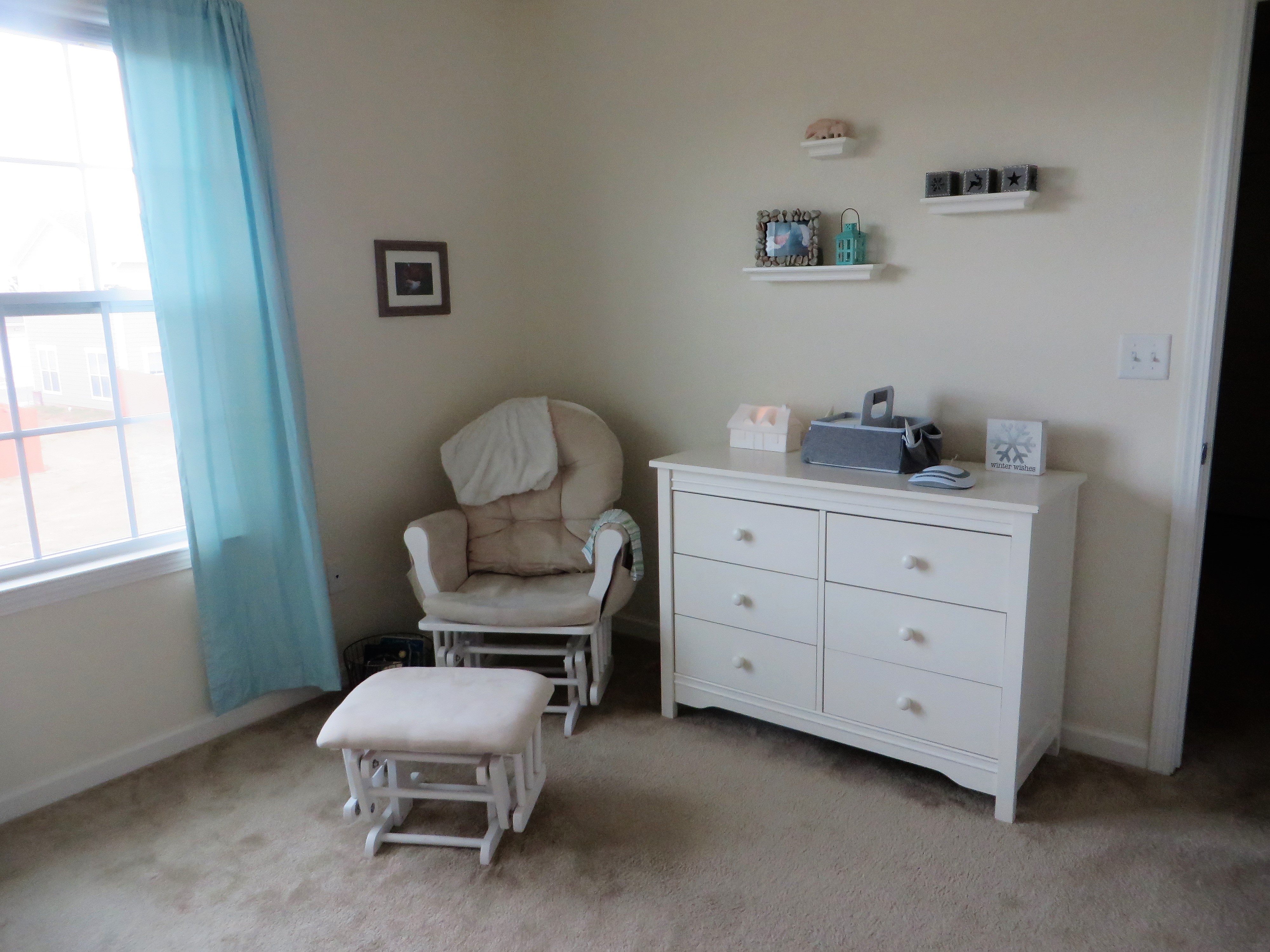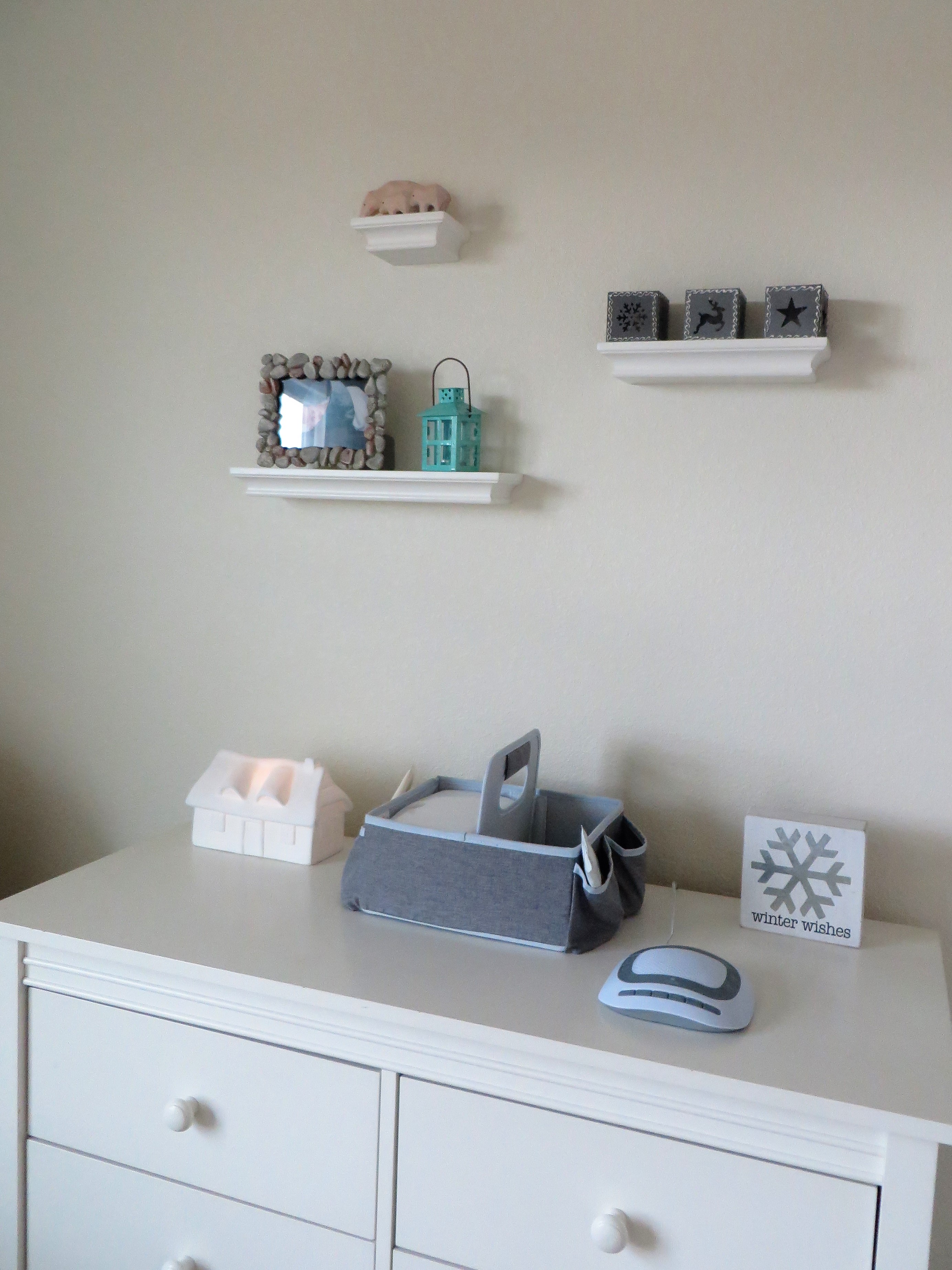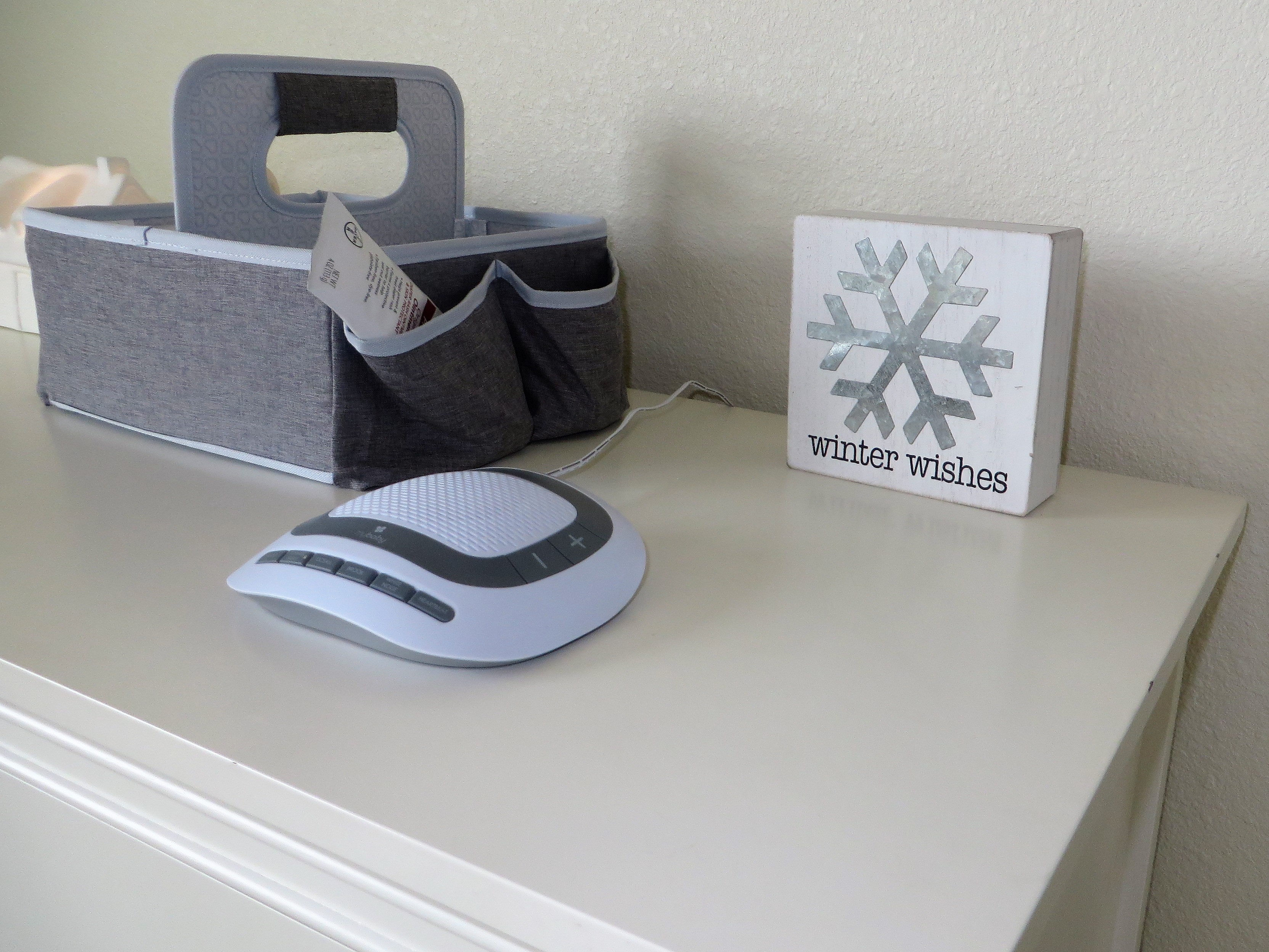 I got a simple diaper caddy for the living room when we were in Little Rock, and I decided to just move it into Berend’s room when we moved to Clovis. It matches, and it holds what I need for the few diaper changes that actually happen in his room since it’s upstairs. I got the same sound machine I have for Gerrit (the updated version), and the “winter wishes” sign is something I picked up at Hobby Lobby.