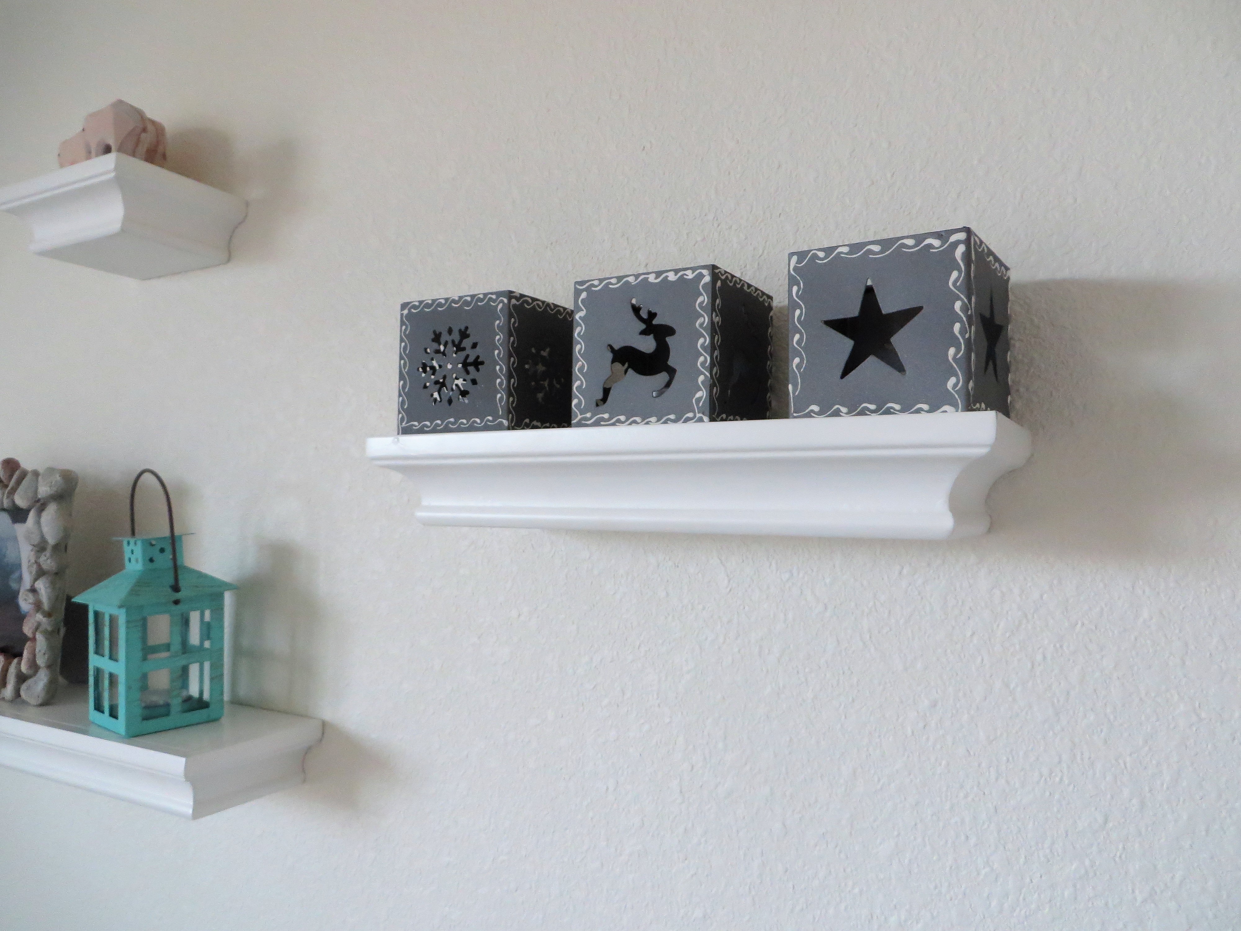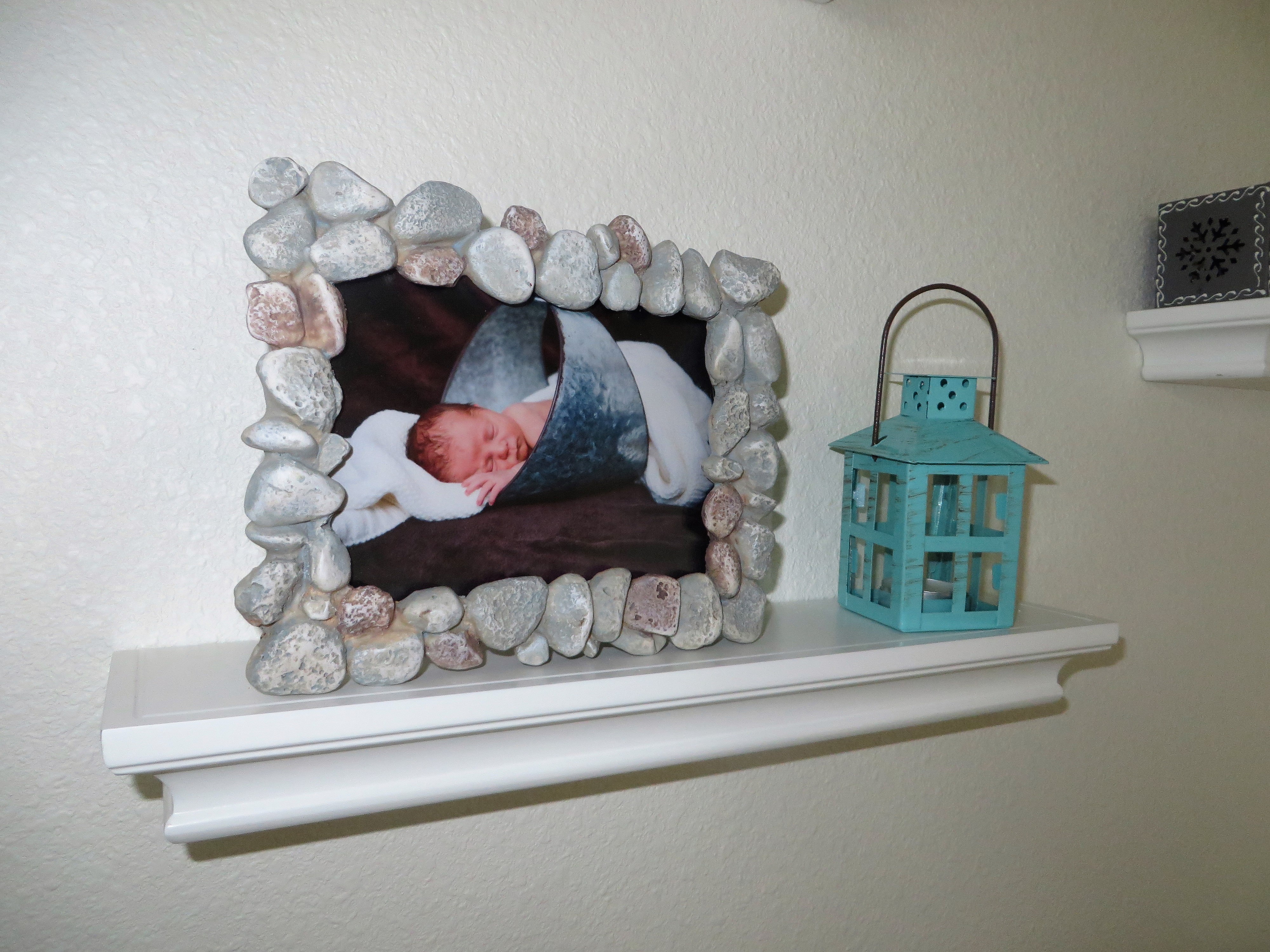 The stone frame is from Gerrit’s beach nursery, and I found the little aqua colored lantern on Amazon.