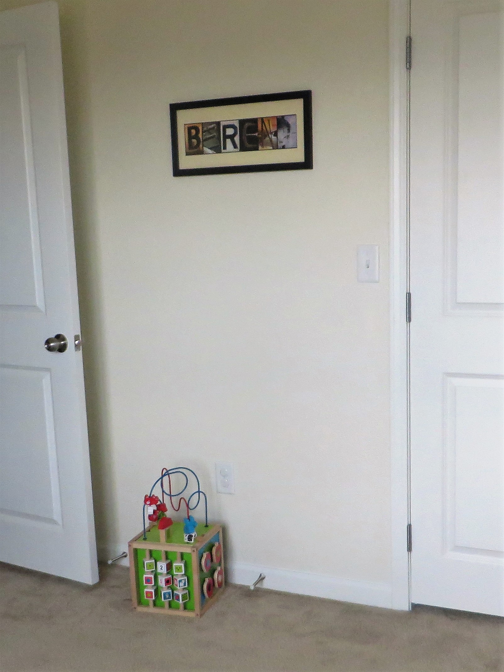 Over on the wall with Berend’s closet is this name art from my friend Emily. She had gotten a similar one for Gerrit when he was a baby, and I love that she thought to get one for Berend as well. On the floor is a simple wooden activity cube that we had gotten for Gerrit for his first birthday. Both boys still enjoy playing with it!