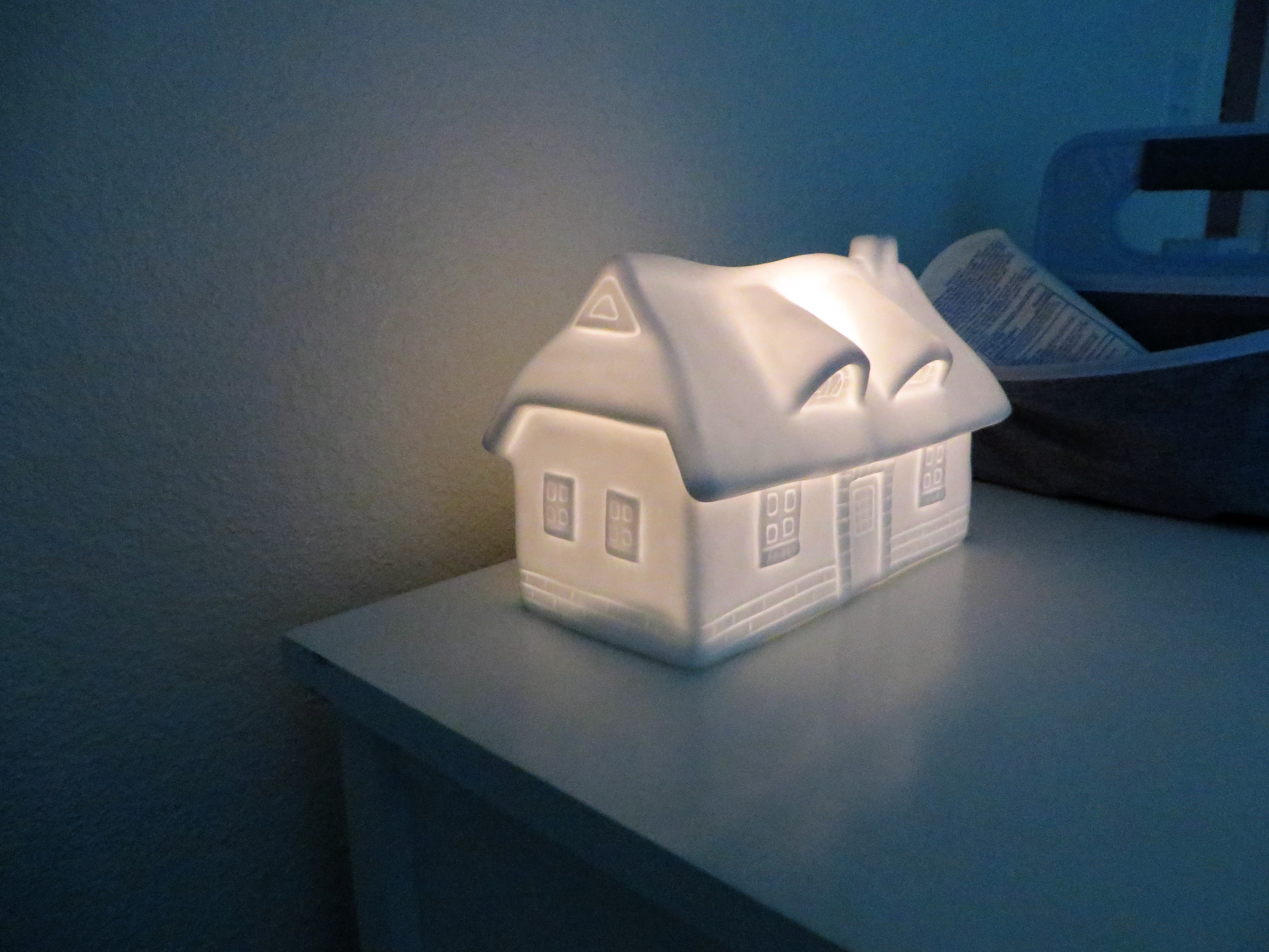It wasn’t my first choice (I was going to go with an animal), but it was on sale, and once it arrived, I fell in love with it! It looks like a snow-covered cottage on Berend’s dresser, and it gives off just the right amount of light.