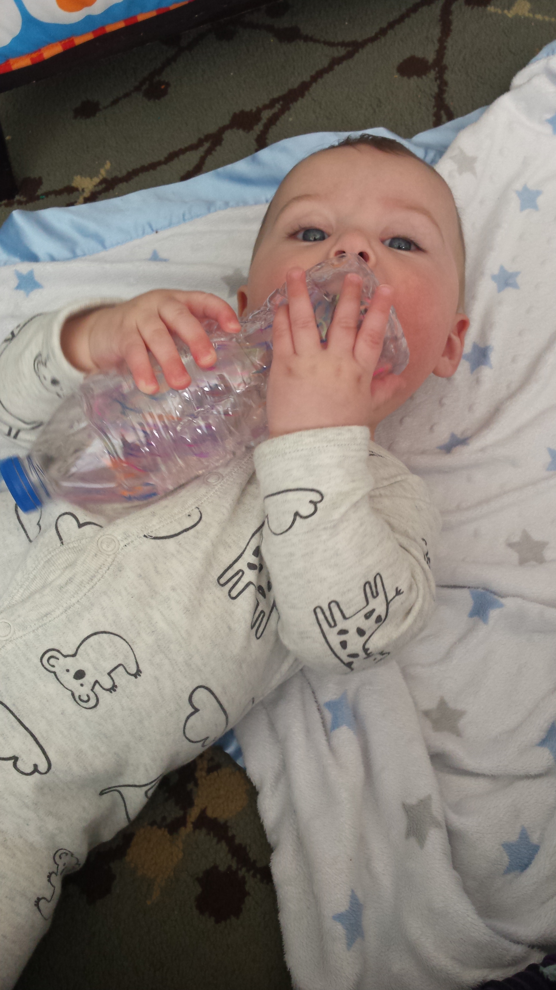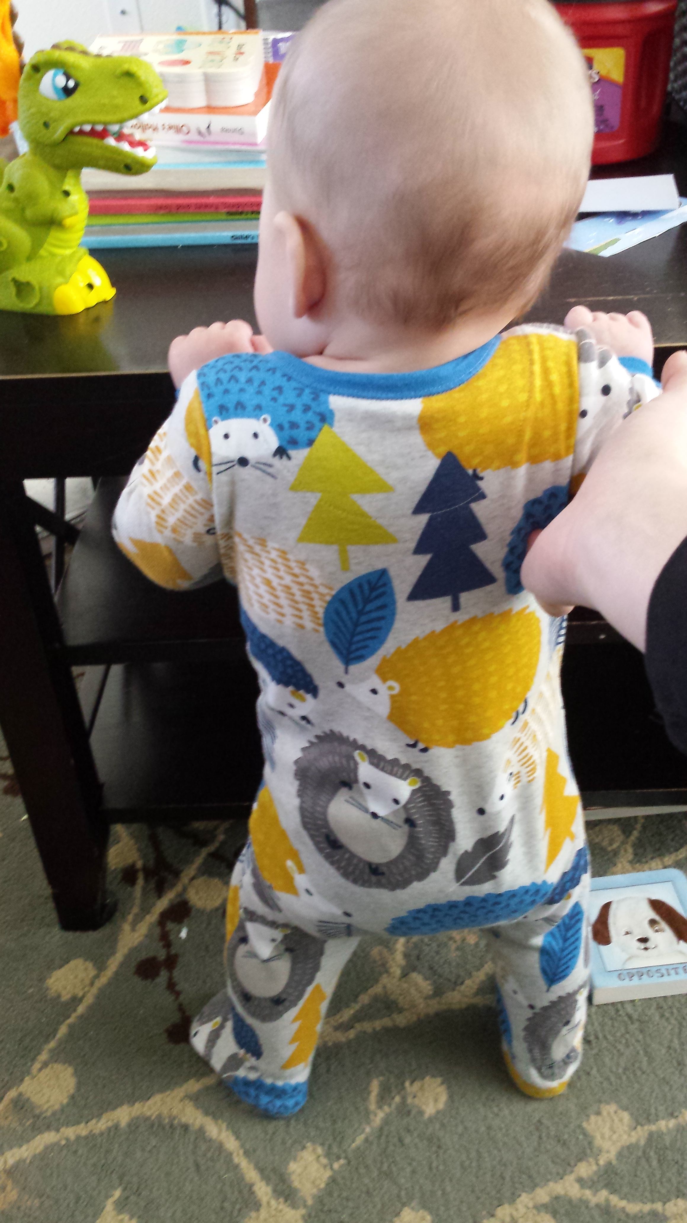 Likes: being carried, standing with assistance (but he tries hard to only use one hand), walking with assistance, baths, tickles, food, bouncing, babywearing, putting everything in his mouth, sucking on his bottom lip and his tongue