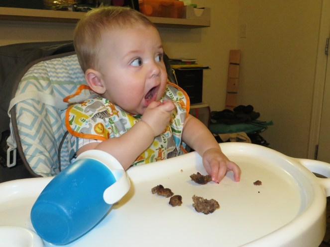 Eating: Ugh, I suck at remembering to offer food to Berend! He continues to do fairly well with solids. He seems to be getting better at moving solids to the back of his mouth to swallow, but he still occasionally gags and throws up a bit. I’m not sure he likes banana, but most other things he seems to enjoy. Berend really enjoys meat just like his big brother!