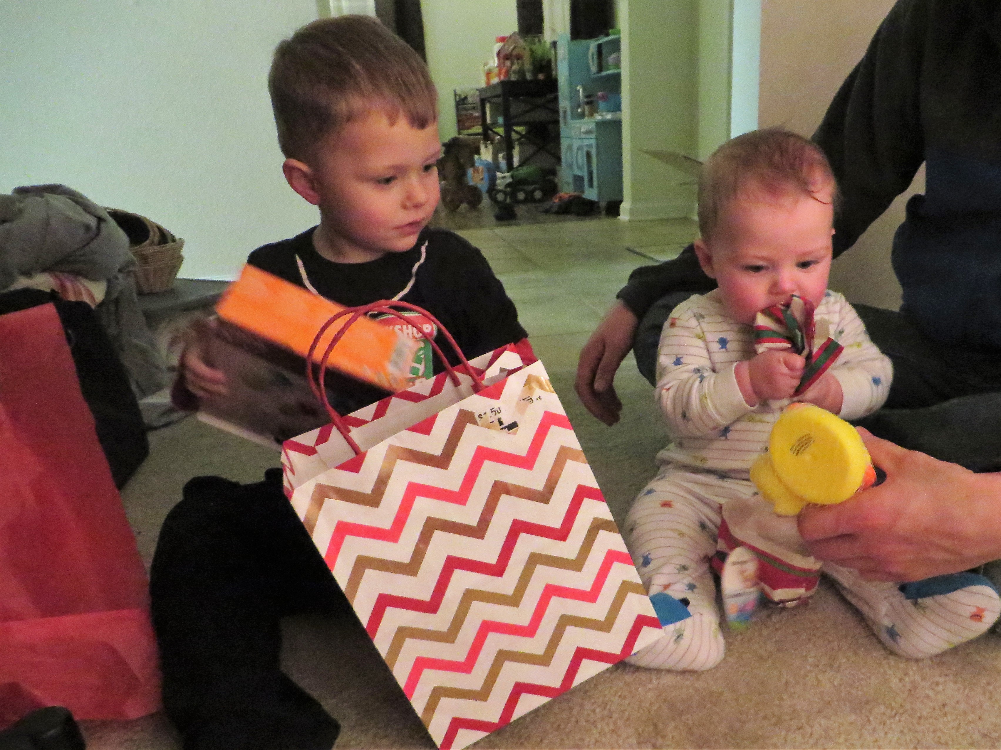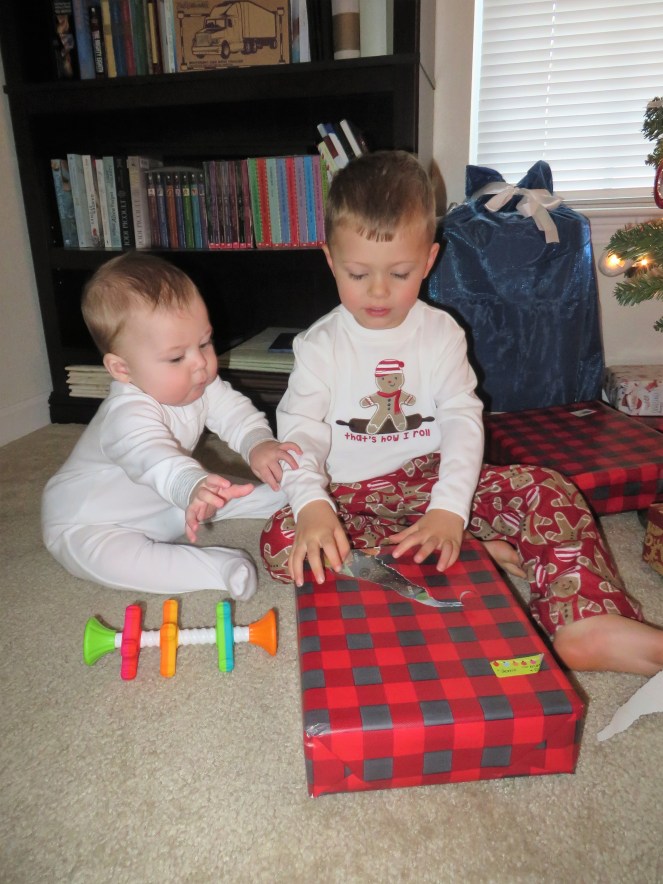 Berend’s first Christmas Eve… and both of my boys’ first sibling gift exchange! They got each other bath toys.