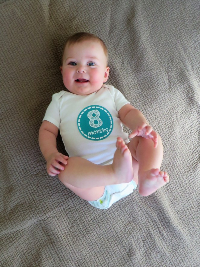 Milestones: army crawling, pulling up to standing, cruising around furniture, saying “baba,” developing his pincer grasp, standing unsupported for several seconds