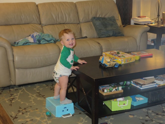 Likes: playing with Gerrit, baths, meals, Mama (bordering on obsession), tickles, going outside, rummaging in the refrigerator, finding tiny things to put in his mouth, unraveling the toilet paper roll, mouth sounds (blowing raspberries, spitting, clicking his tongue, smacking his lips… and don’t forget his trademark growling!), dropping & picking up toys, being walked around, climbing on top of baskets/boxes/toys, eating shoes, climbing up and down the stairs like a pro, snuggling with Mama in the wee hours