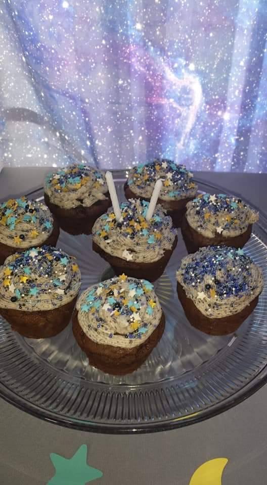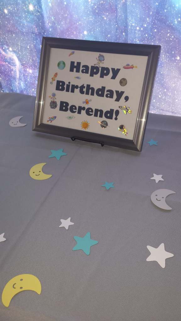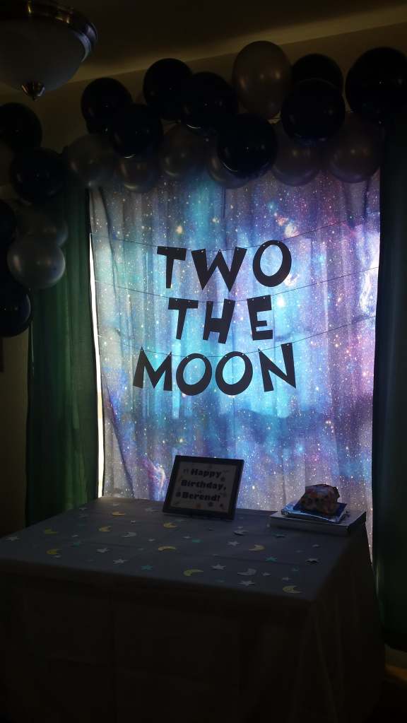 Unfortunately NONE of the pictures with Berend or his friends were savable. I made a little balloon decoration, got an inexpensive space shower curtain as a backdrop, and used my Cricut to make the letters for the banner and the space confetti on the table. I made cookies ‘n’ cream cupcakes with galaxy sprinkles for dessert. I also set up a quick moon rock hunt (Easter eggs filled with goodies and covered in aluminum foil) in the backyard for the kids. It was very low-key, but we had fun celebrating our new two-year-old!