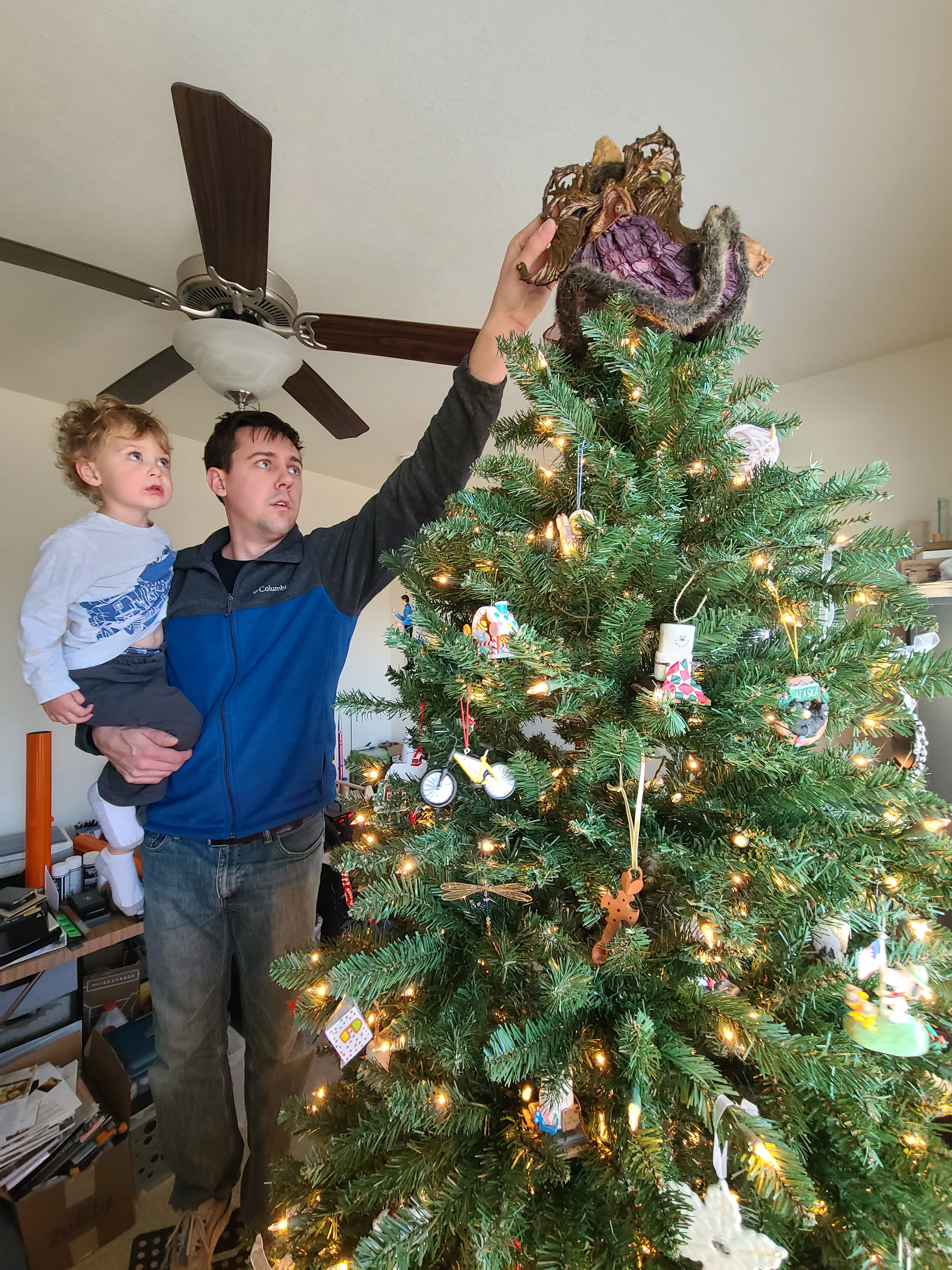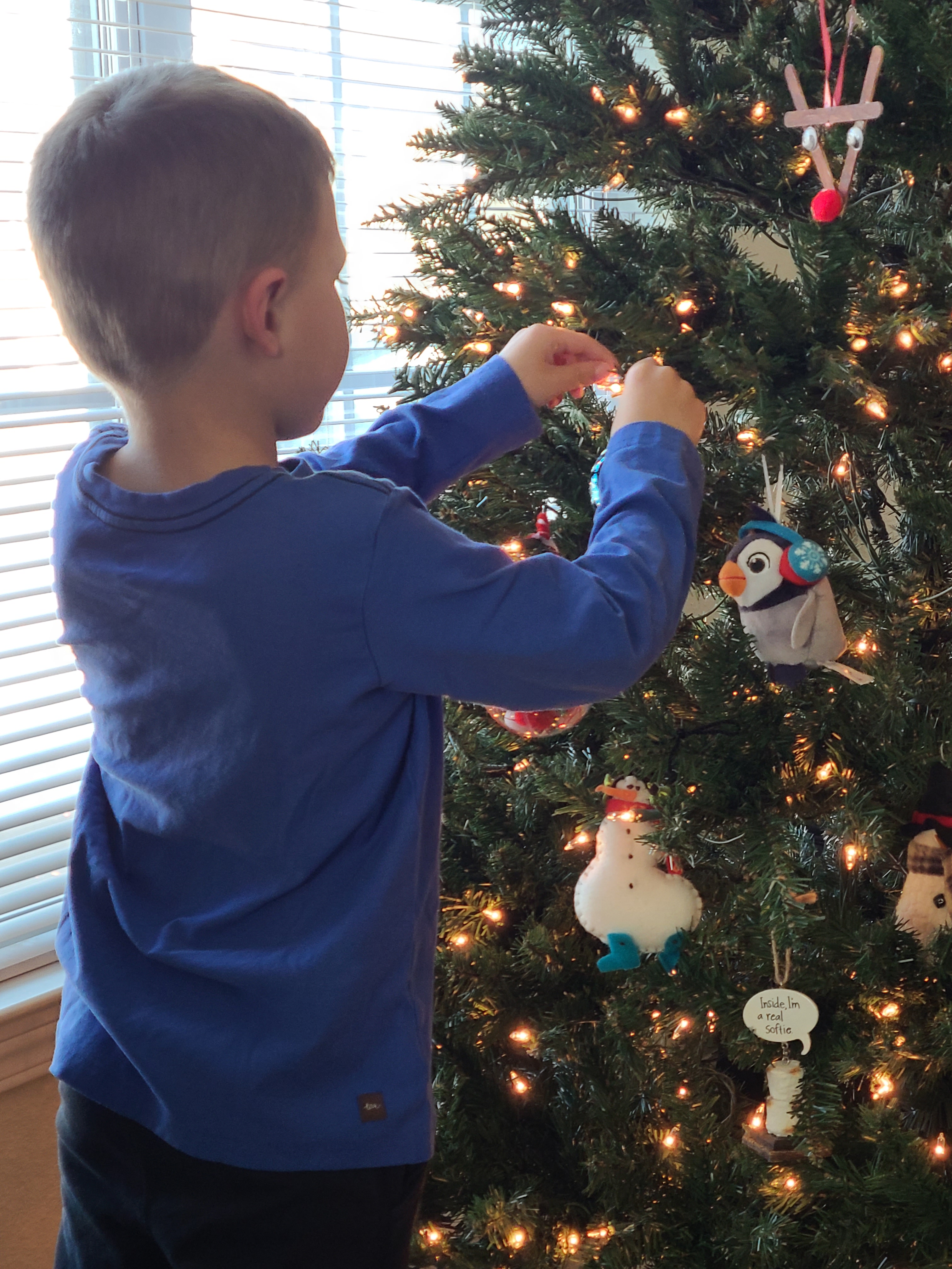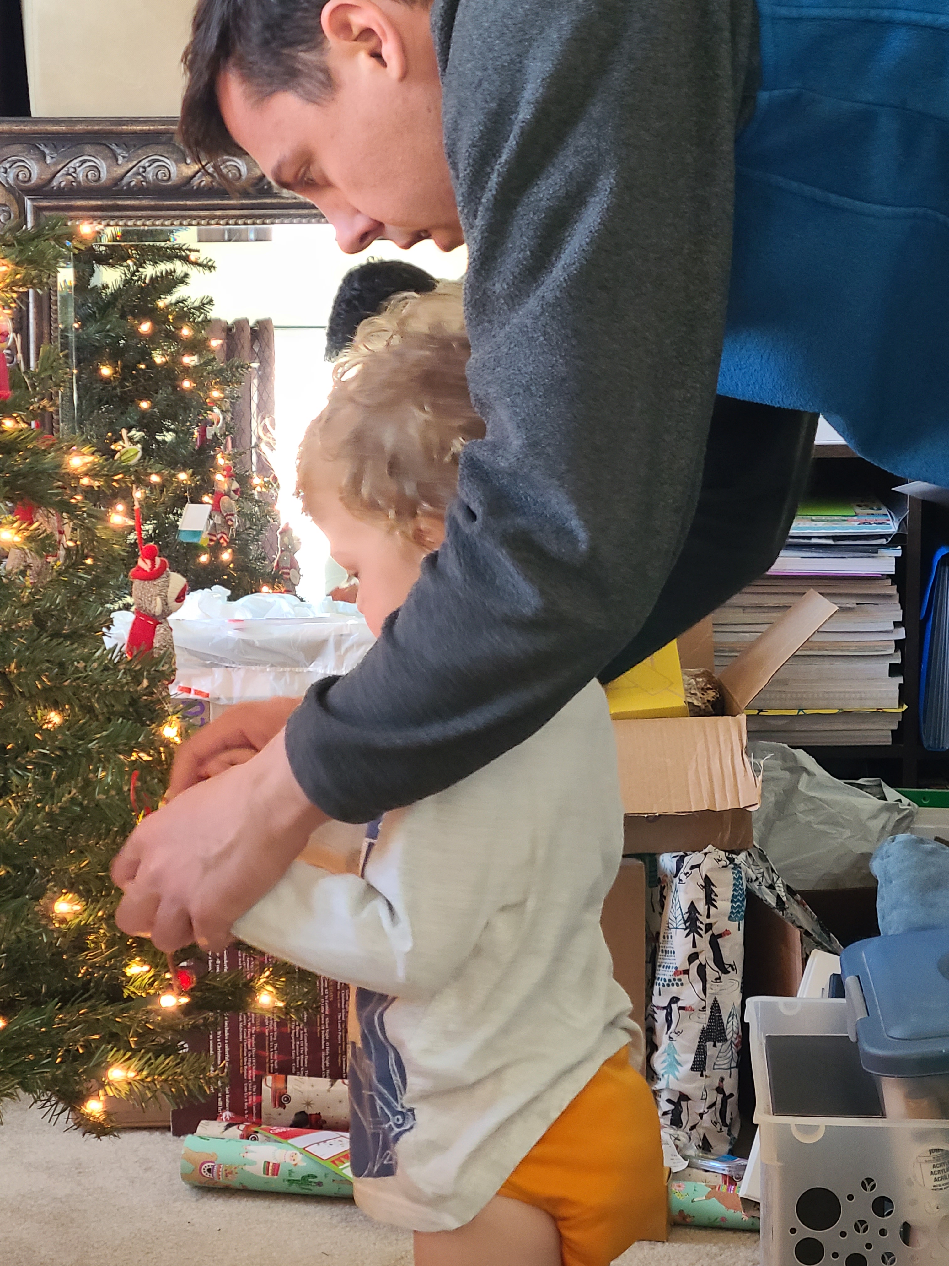 After Thanksgiving, we pulled out our Christmas tree to decorate! This was probably my least stressful year of decorating the tree. I didn’t even bother pulling out any ornaments besides the boys’ while they were excited about the tree. Once they had their ornaments up, Andrew and I added our own (letting them help when they wanted to). This year Berend helped Andrew put the angel on top of the tree! And this was the first year I added some decorations to our front porch as well.