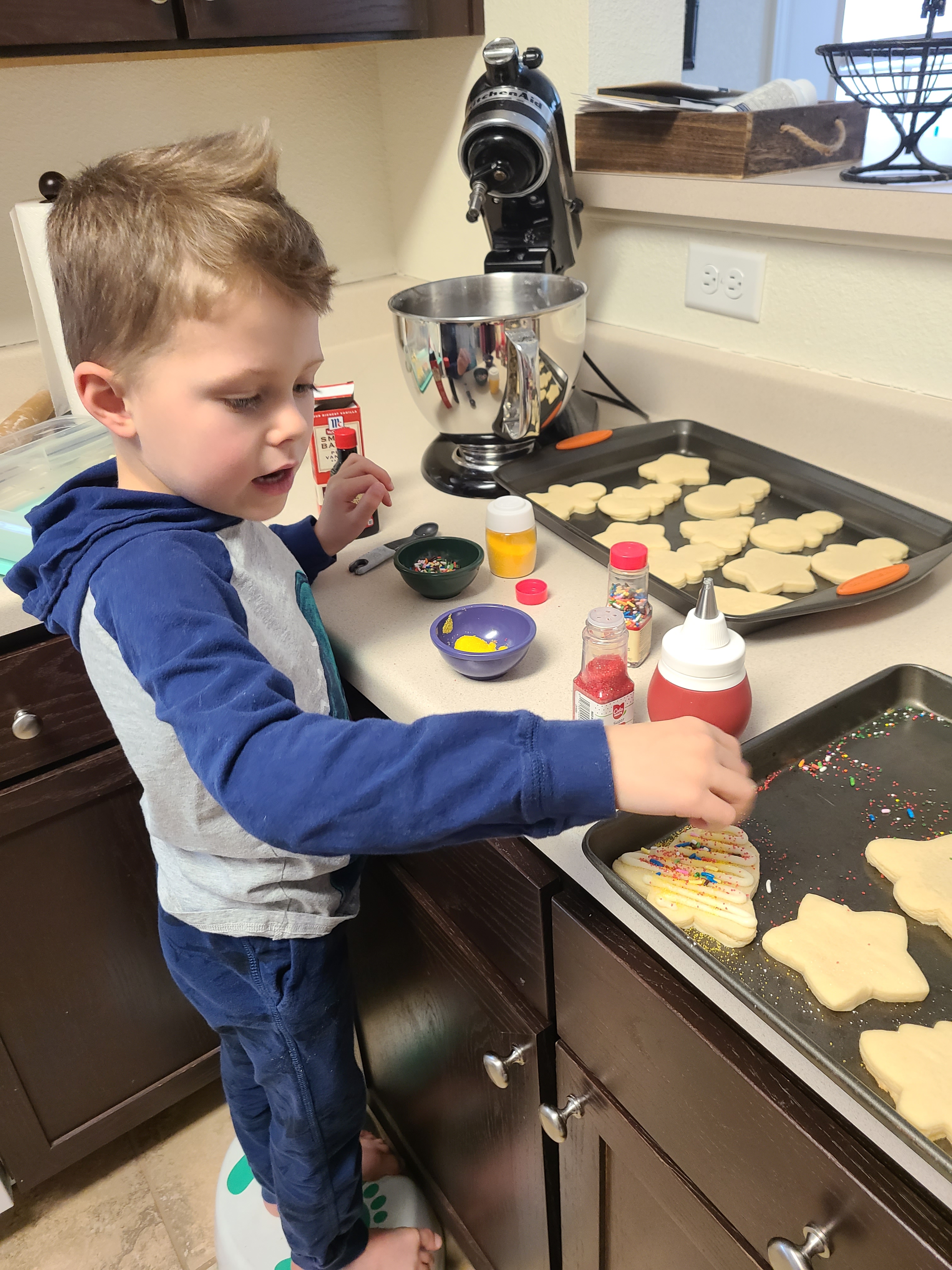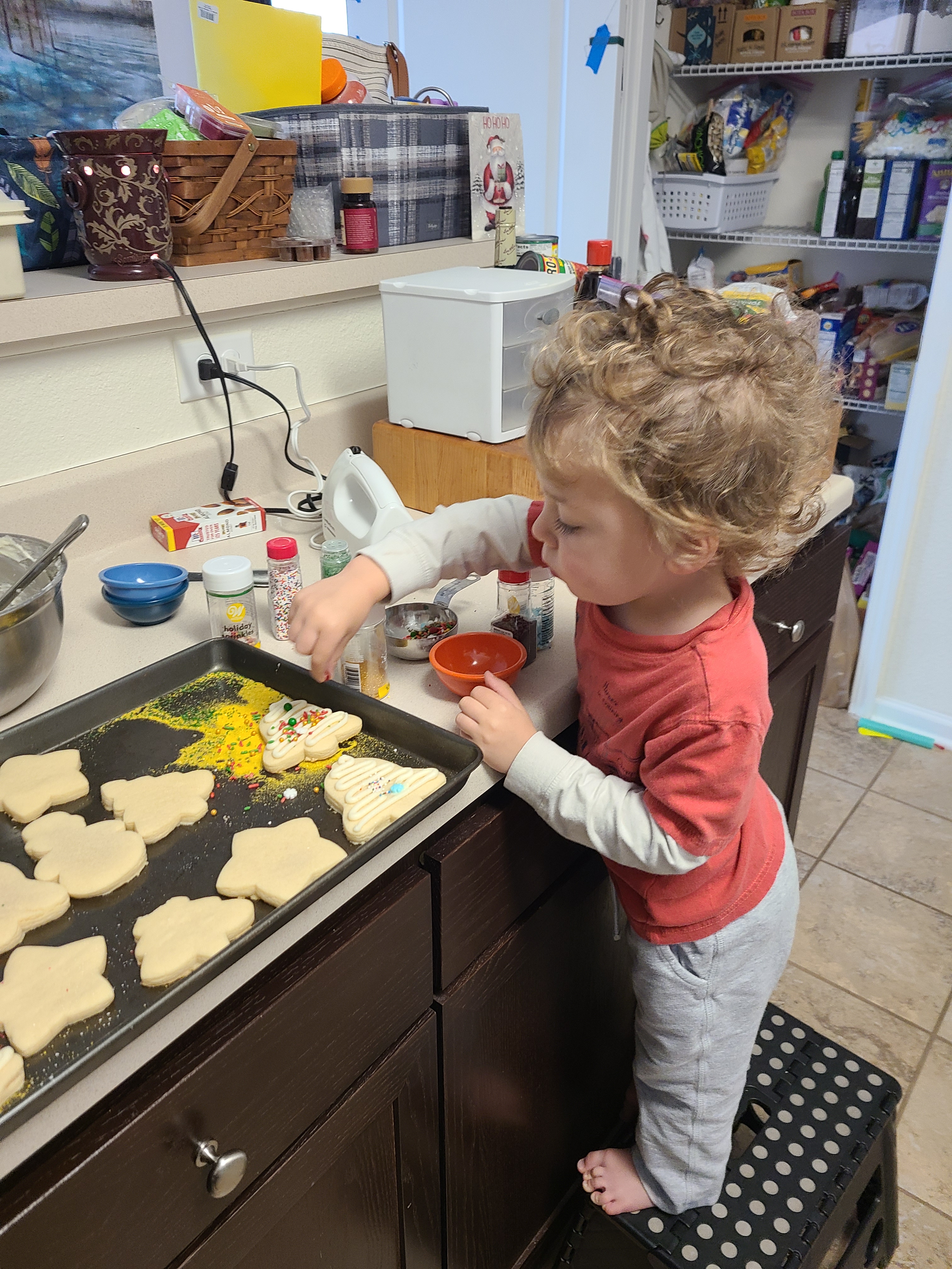 We spent the rest of December trying to do some fun holiday things and make the time pass while Andrew was gone. I feel like things were still pretty locked down that month, but we enjoyed the holiday parade the base put on and the Glitter & Glow Light Show. We also had fun decorating sugar cookies together! I think this was the first year that cookie-decorating was really fun with two kids. The previous year stressed me out! All those sprinkles with an 18-month-old and a 5-year-old… yikes. But surprisingly, deployments and TDYs make me chill out about some things, so maybe I just went into it with a better attitude.