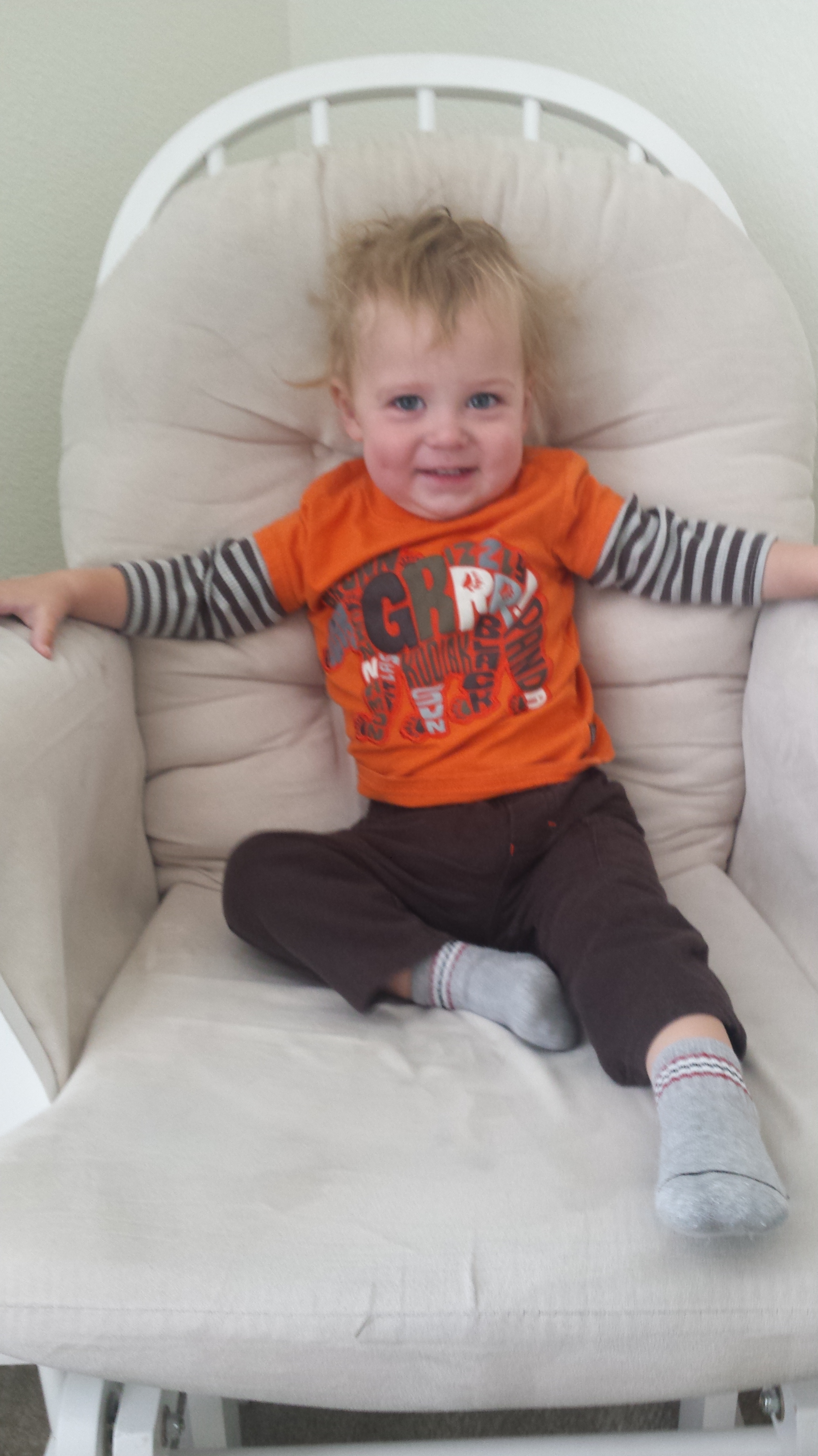 Milestones: saying more words, knows all common body parts, shakes head no & nods yes (plus says “no” ALL the time), can throw & catch a ball, shows affection & empathy (gives hugs or pats back if he thinks you’re sad), scribbles with crayons & markers, connection to a lovey (Bear)