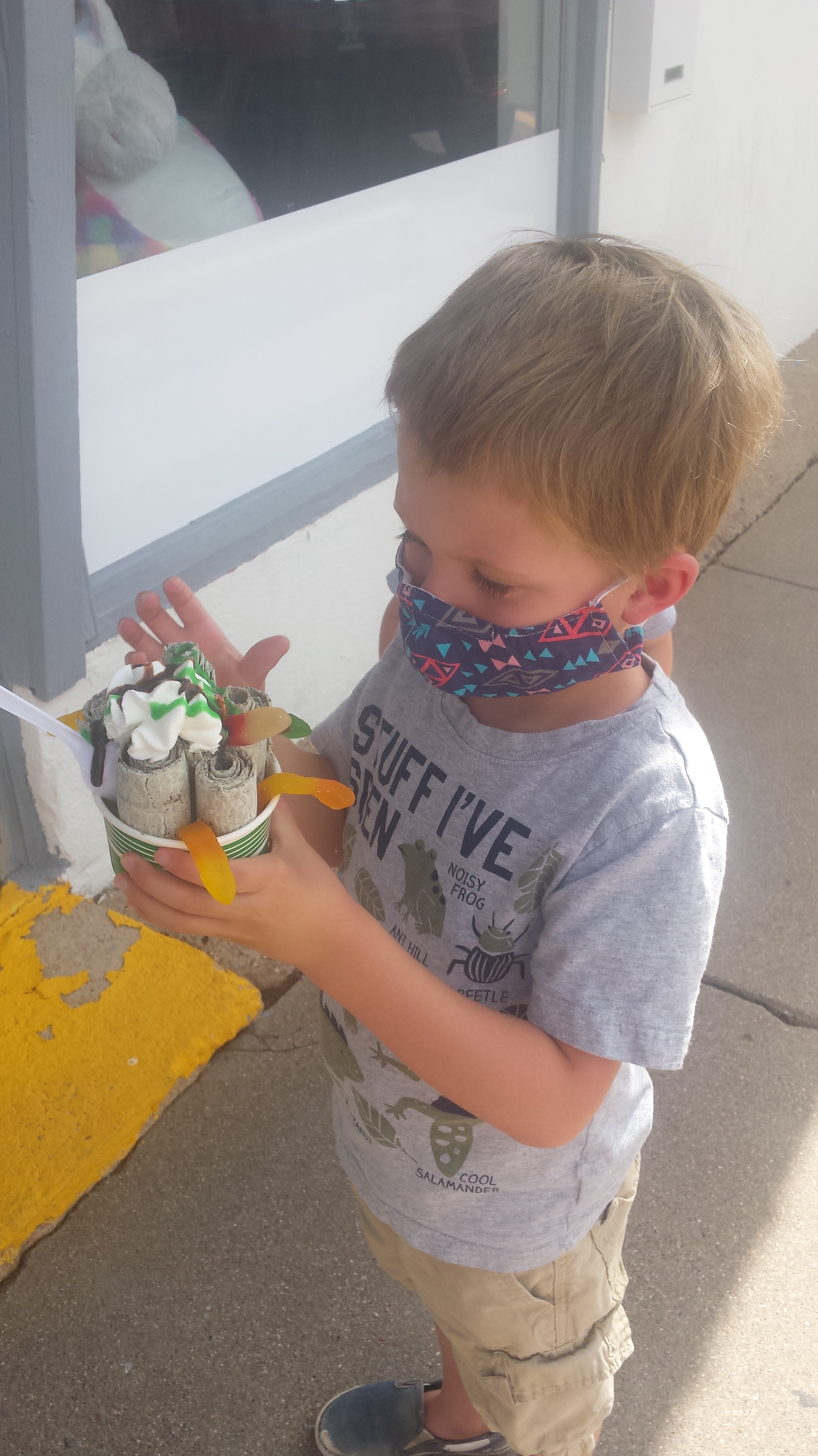 July 2020: Gerrit gets a cheetah, going out for rolled ice cream at The Unicorn, 4th of July at home, roasting marshmallows & making s’mores, day trip to Palo Duro Canyon in Texas, working on his beloved Minecraft workbook, playing with ice chalk, working on Lego creations, chalk paint, matching shirts with Berend