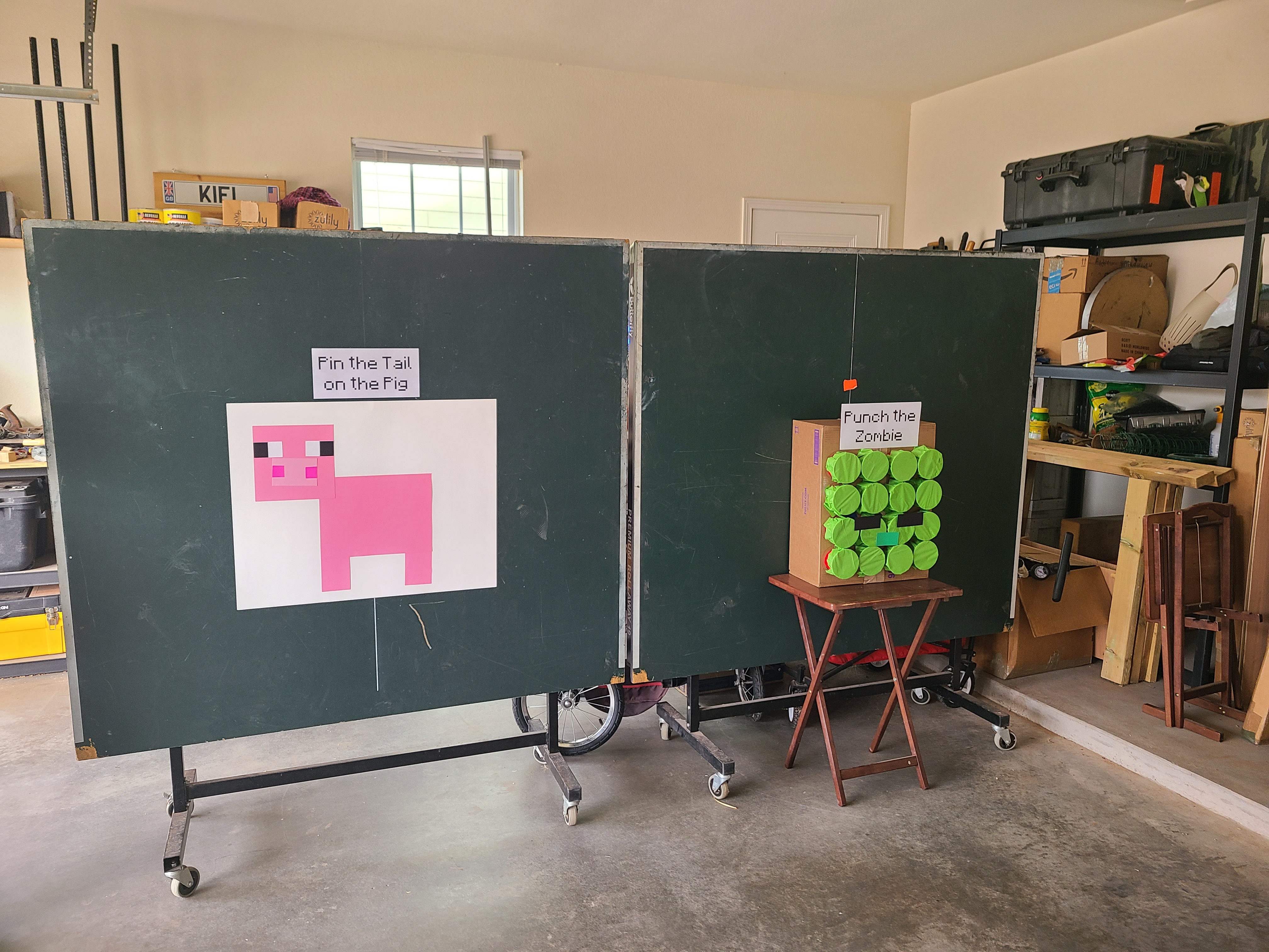 I usually give the kids the option of renting a bounce house or doing party games/activities, but this year we just went straight for games to avoid too much contact. We did a pin-the-tail-on-the-pig game, punch-a-zombie prize game, and of course, a ghast piñata. I was thankful to have my mom help me with decorations and Andrew put together some awesome Minecraft creatures out of boxes and spray paint. Gerrit had so much fun with his friends!
