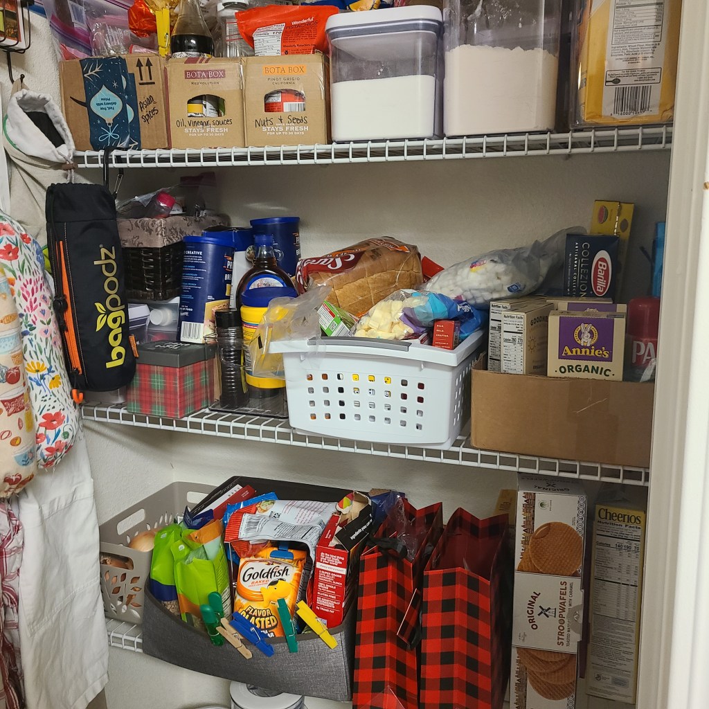 I do the same thing in my pantry. It’s not a huge pantry, so keeping like items together helps keep things organized. I have a bin with snacks (with clips right on the side wall for chip bags) at the kids’ level, I have another with baking items (things like baking soda, bags of chocolate chips, various extracts, packets of yeast, etc), and Andrew has his own bin of all the random Asian ingredients he acquires for different dishes he wants to make. I repurposed some wine boxes to organize oils and vinegars that don’t fit in the spice cabinet as well as one for nuts and seeds. I keep all of our pasta and pasta stuff (sauces, Parmesan cheese) in an old Amazon box. I’d love to have a beautiful pantry with matching bins and baskets, but I also like instant results that don’t cost me a thing! So a lot of my pantry is organized with empty cardboard boxes that I just write on with a Sharpie.