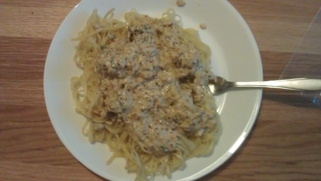 2. Add the onion and garlic to the pan, and cook gently for several minutes to soften the onions. Drain the pasta, reserving 1/2 cup of the water. Add the cream cheese to the onions with the pasta water and mustard. Gently heat until the cheese has melted, then stir in the parsley and meatballs.