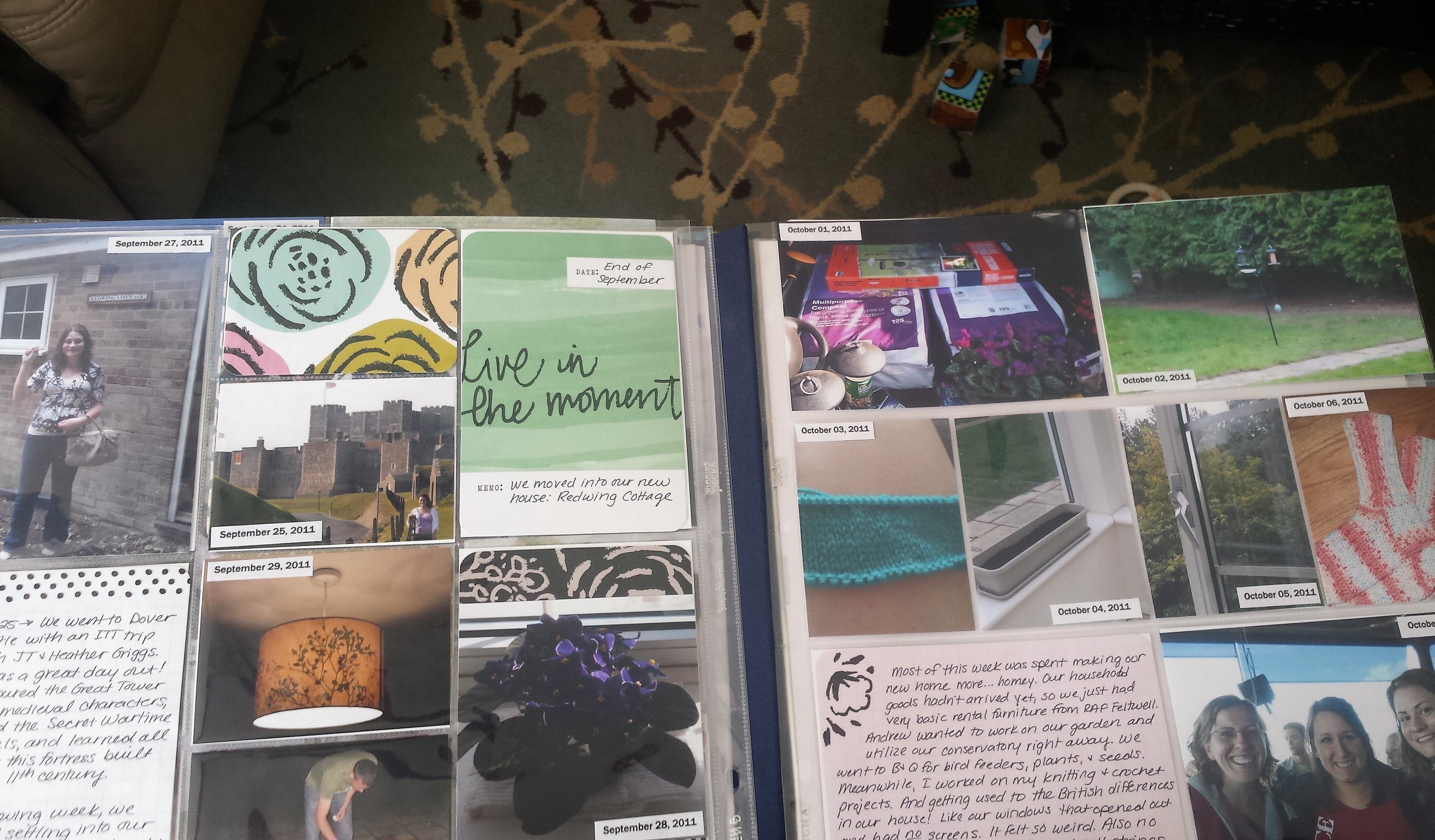 I have started getting back into scrapbooking though! I’ve been itching to get back into one of my hobbies, and I remembered that I had all the supplies for my Project Life/365 scrapbook. This was a project I started 7.5 years ago. I took a photo a day (more or less) for a whole year starting when we packed up to move to England back in August of 2011. So I started printing photos from that year, pulled out the supplies I had for this specific project, and started working on the scrapbook in the evenings.