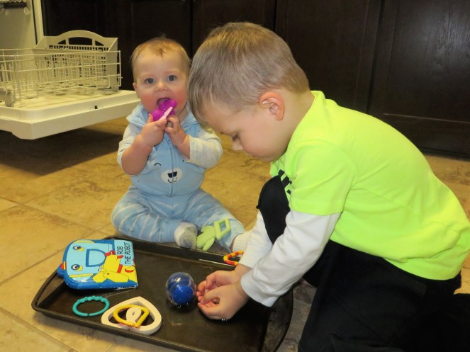 So I don’t actually have a picture of Berend looking at a touch-and feel book, but this past month is when he really started noticing and enjoying the different textures. I think his favorite book is “That’s Not My Monkey;” he actually giggles when we get to the page with the monkey with the hairy eyebrows. I love it!