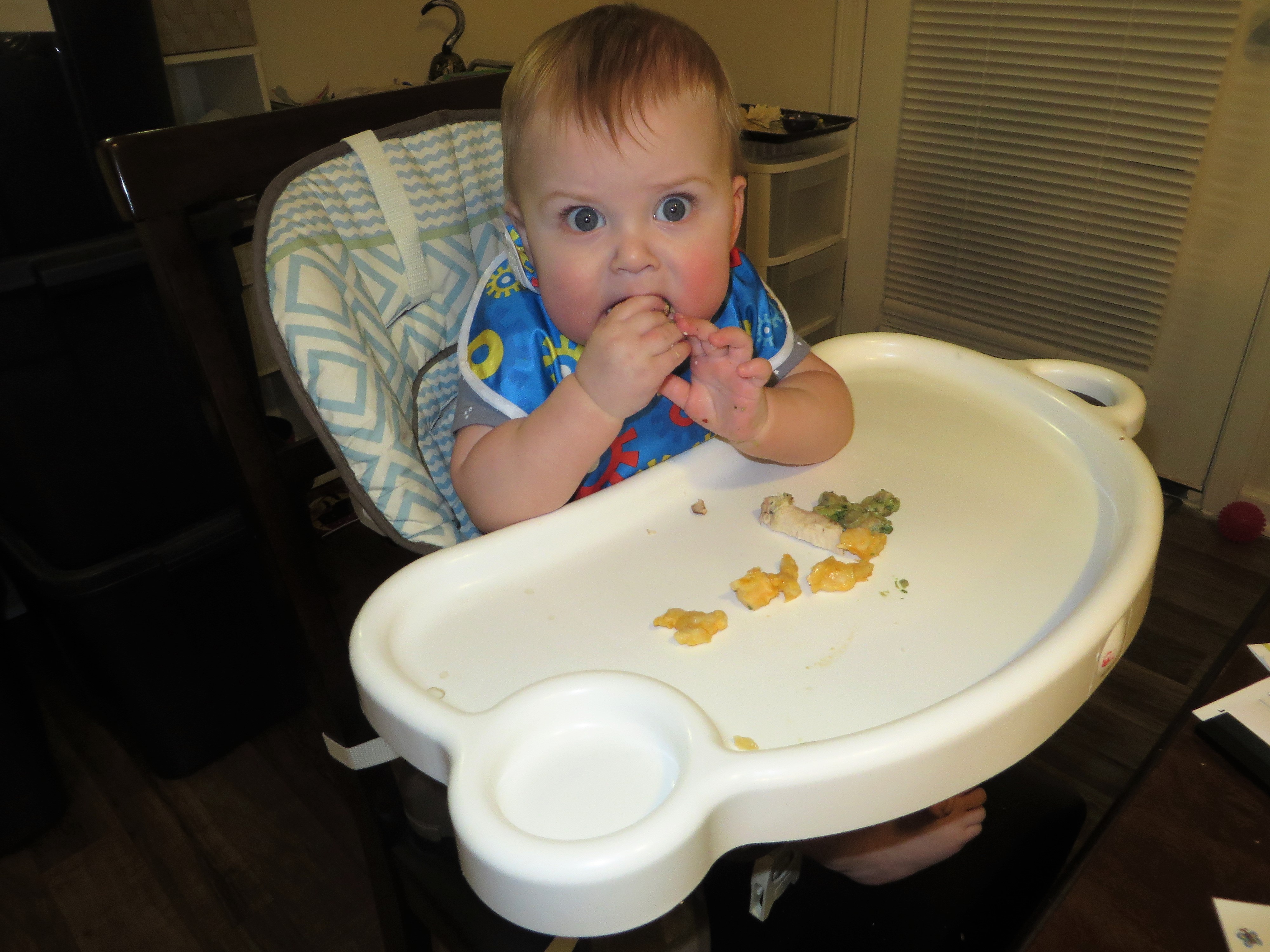 Berend continues to love food! I’m often unsure of how much he has actually eaten (I find a lot dropped in his lap and on the floor), but I don’t worry about it as much as I did with Gerrit. I’m pretty good about offering two meals a day. I usually offer lunch and dinner, and when Andrew is home he usually gets breakfast and dinner. I need to get better about offering 3 meals a day next month, I think.