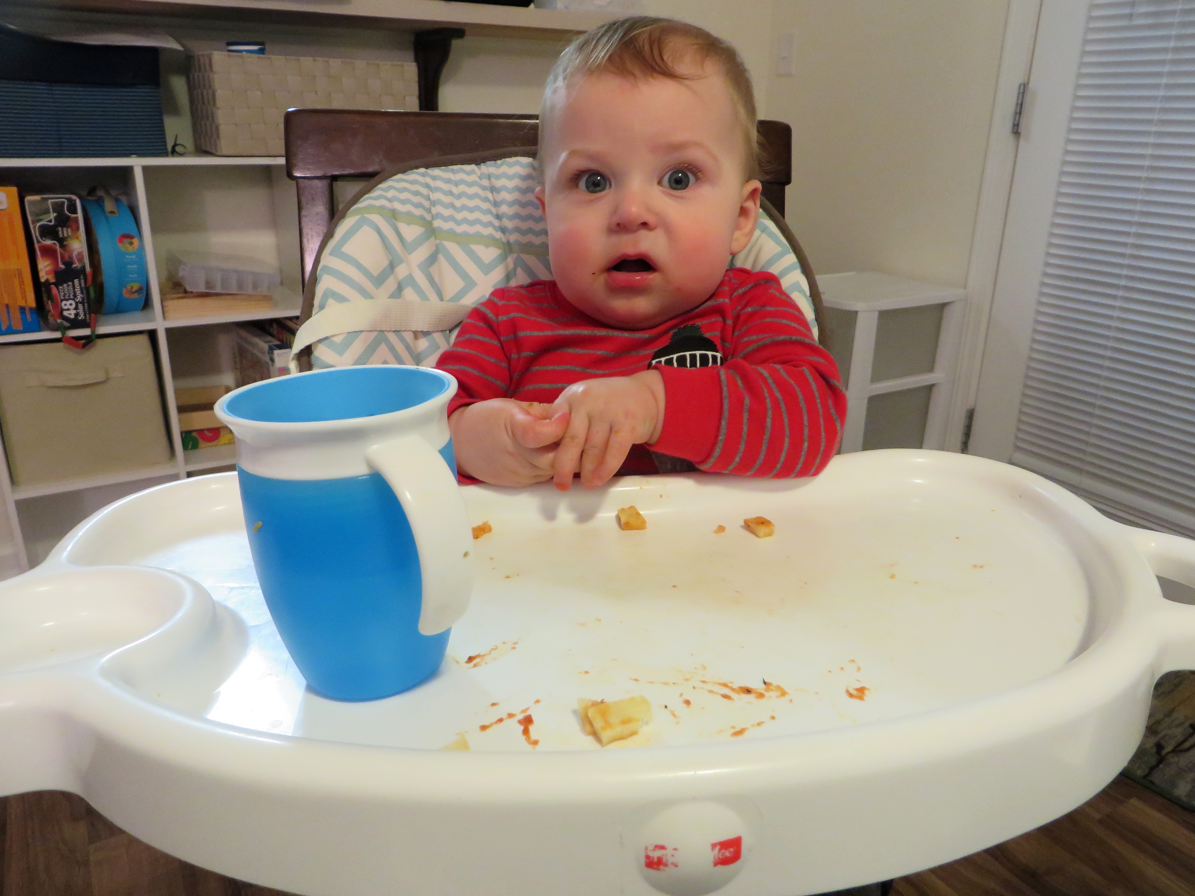 Milestones: soooo close to crawling (he has done one knee forward, then back down to his belly), pincer grasp, perfecting his mouth sounds (tongue clicking, popping sounds with lips, spitting), plays “peek-a-boo,” can get into sitting position from laying down (but only at night in his crib), turns pages in board books, figured out the 360 cup
