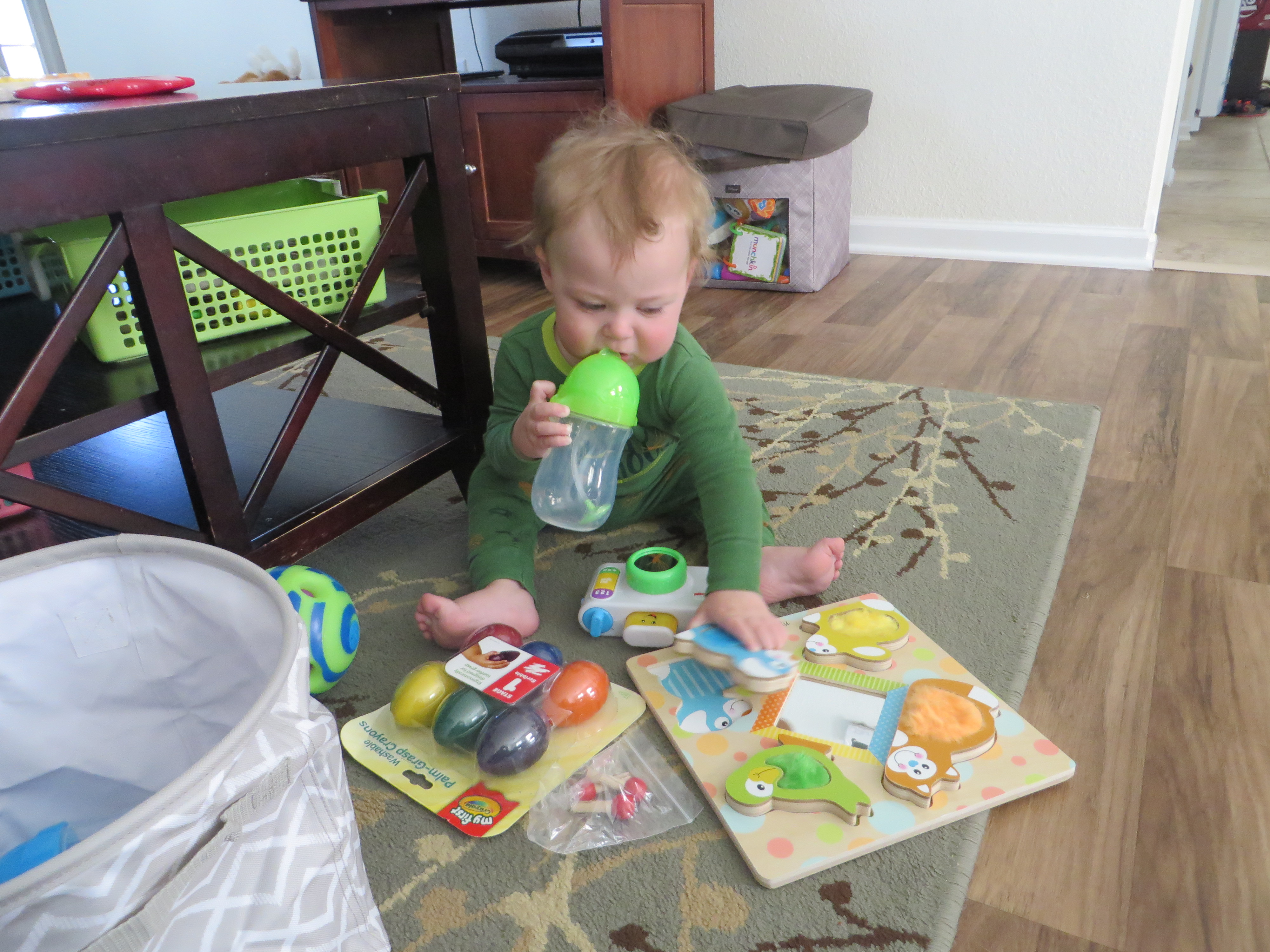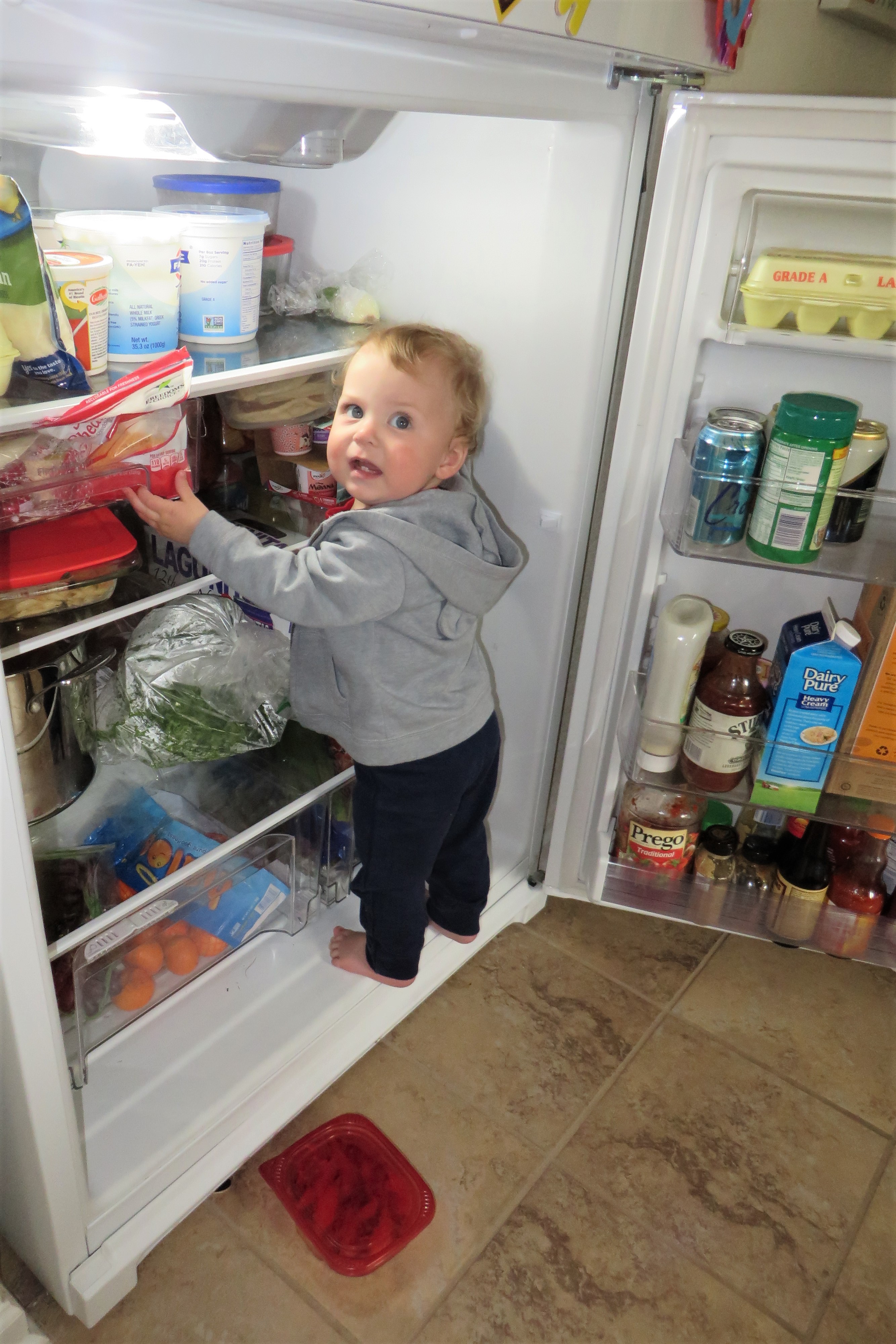 Likes: baths, meals, socks, photos of his family, playing with Gerrit, being with Mama, tickles, going outside, moving things around in the refrigerator, mouth sounds (especially if it involves spitting), growling, being walked around, climbing on things, kicking things