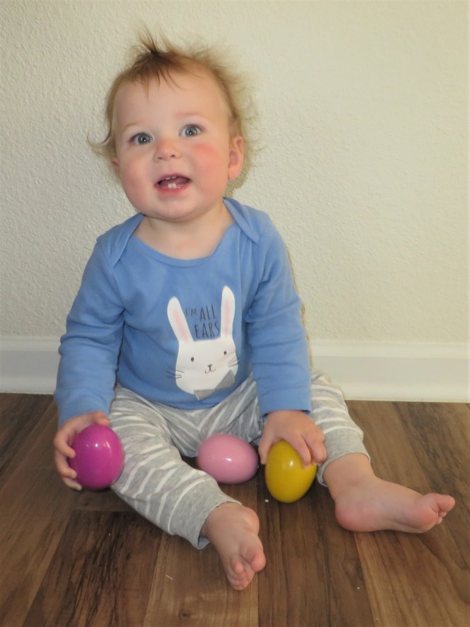 Gerrit was not very excited to be in the car heading back to Texas after our quick trip to the Midwest, but he’s a trooper, and we made it back home just in time for Easter. We missed the base Easter activities, but I had set up Gerrit’s Easter basket before we left, and I had some little treats ready for him for a backyard Easter egg hunt. He had so much fun!